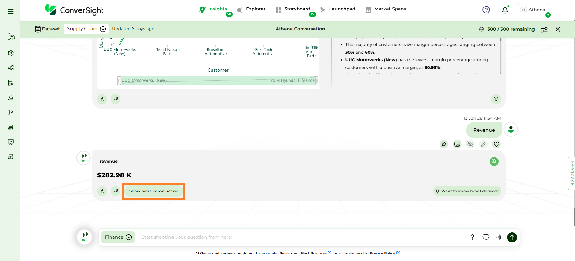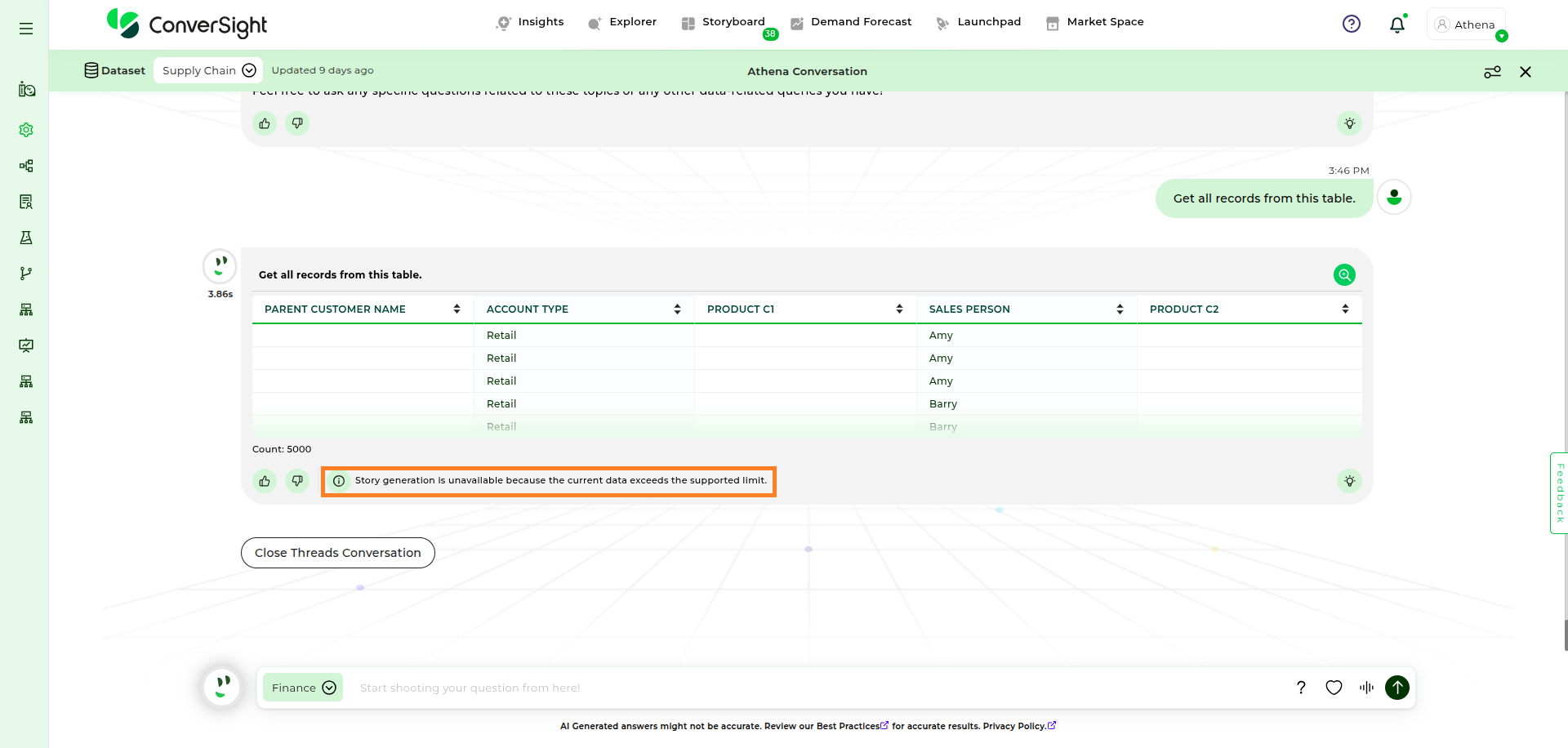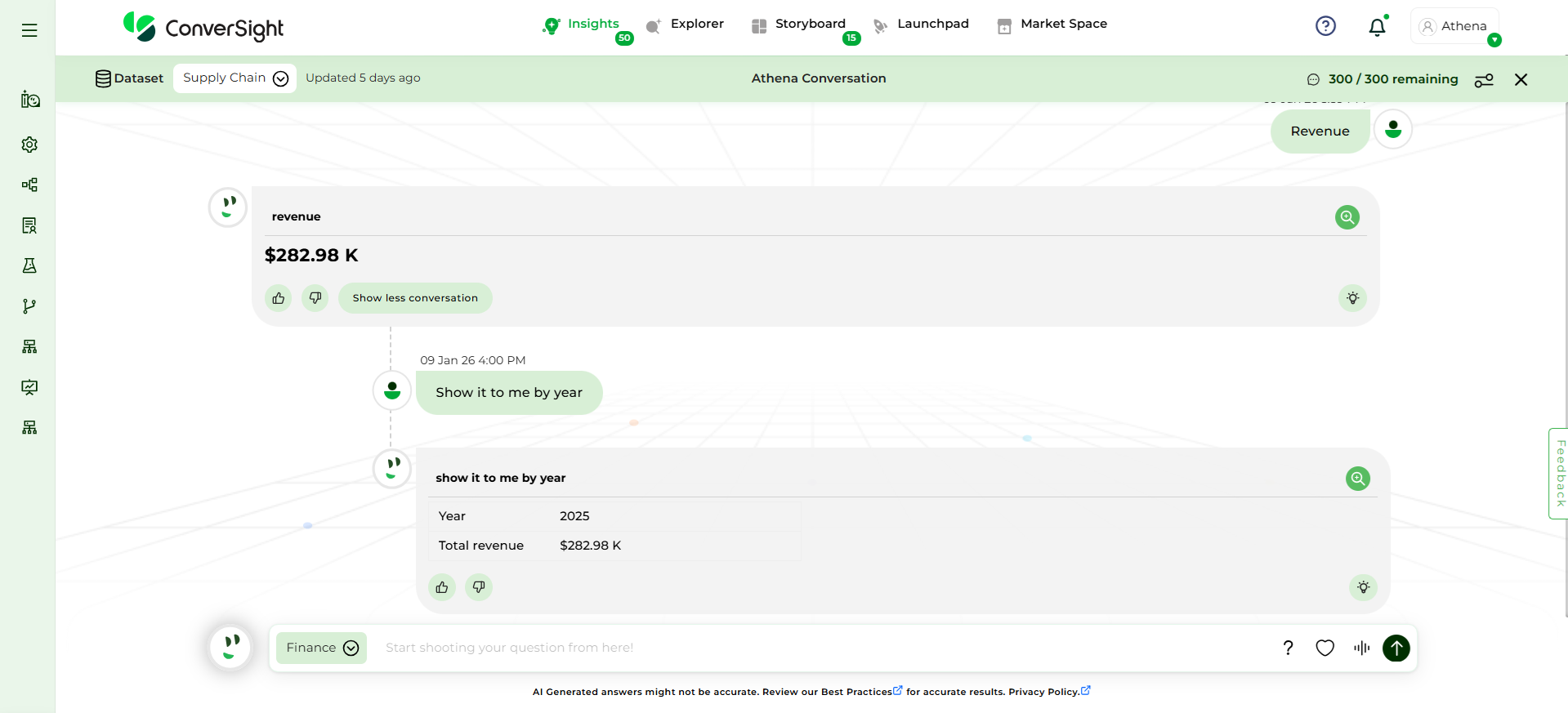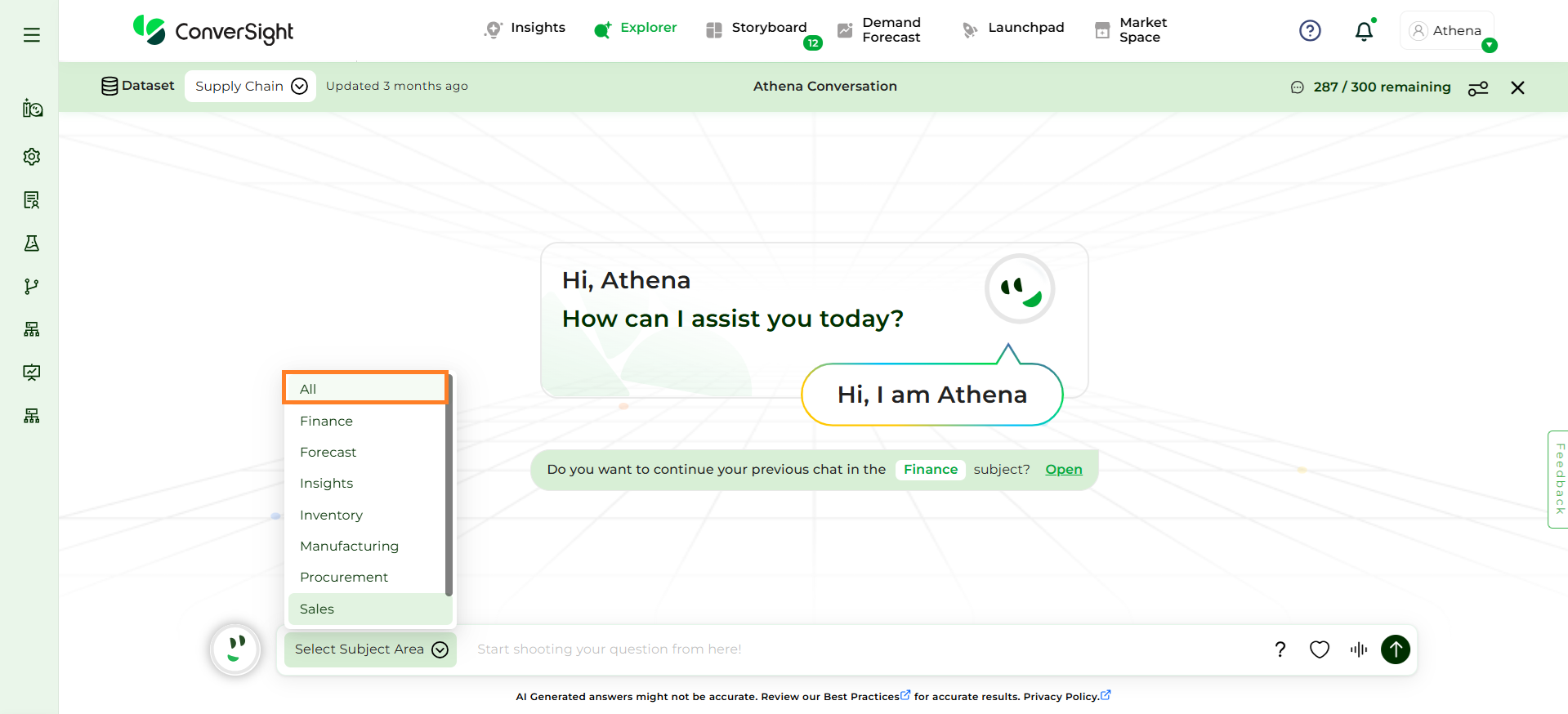 Focus on Domain-Specific Queries: Athena is optimized for questions related to the domain or business area you have selected. Ensure that your queries are specific to this chosen domain for accurate results.