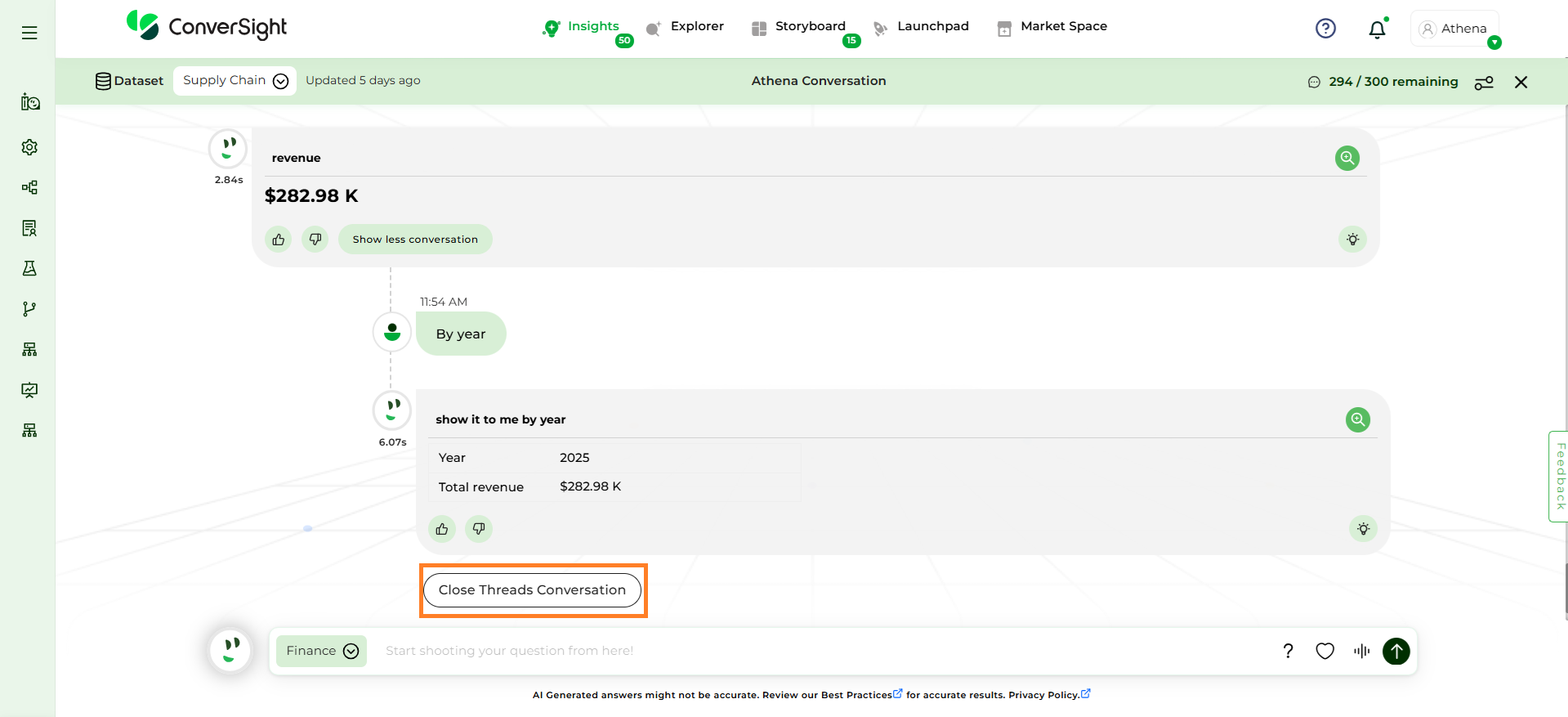 Once you ask a question in Athena and receive a response, the next interaction is a threaded conversation.