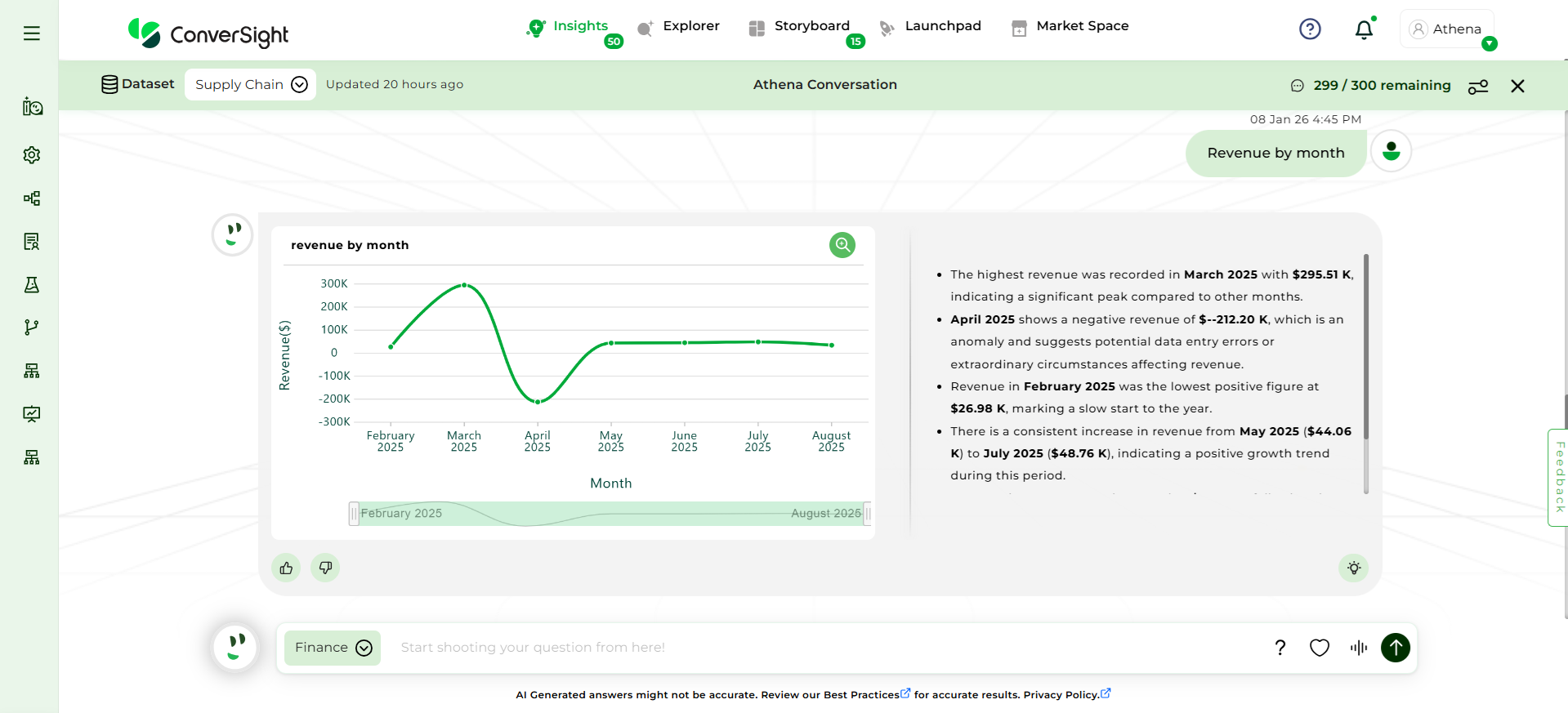 For example, when you query “Revenue by month”, you will get a chart with the correct information based on the data provided.