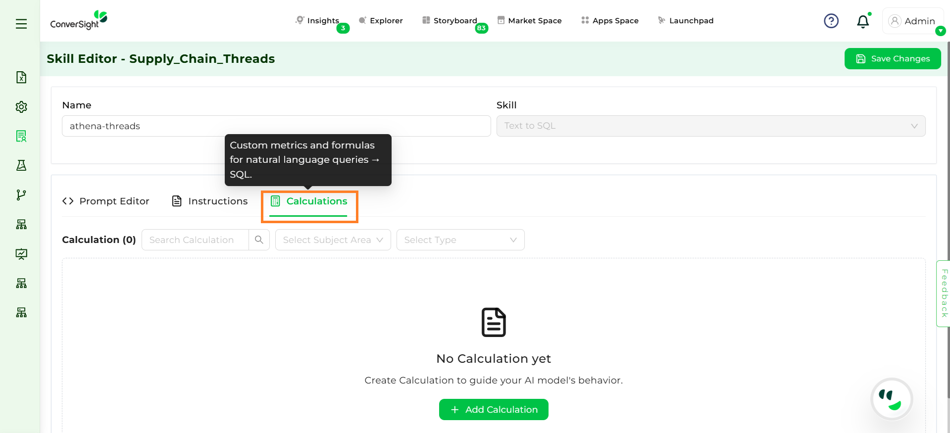 Calculations in the Skill Editor are custom formulas or metrics that Athena uses when answering queries, allowing users to define business-specific computations directly in the platform so results remain accurate without manual SQL modifications. They can be static (used for all queries) or dynamic (applied only in relevant contexts), giving flexibility across subject areas and scenarios. Unlike template-level formulas, these are business-driven and defined directly by dataset admins, who can add, update, or remove them dynamically, tailoring calculations to specific contexts and giving business teams control without relying on engineering changes.
