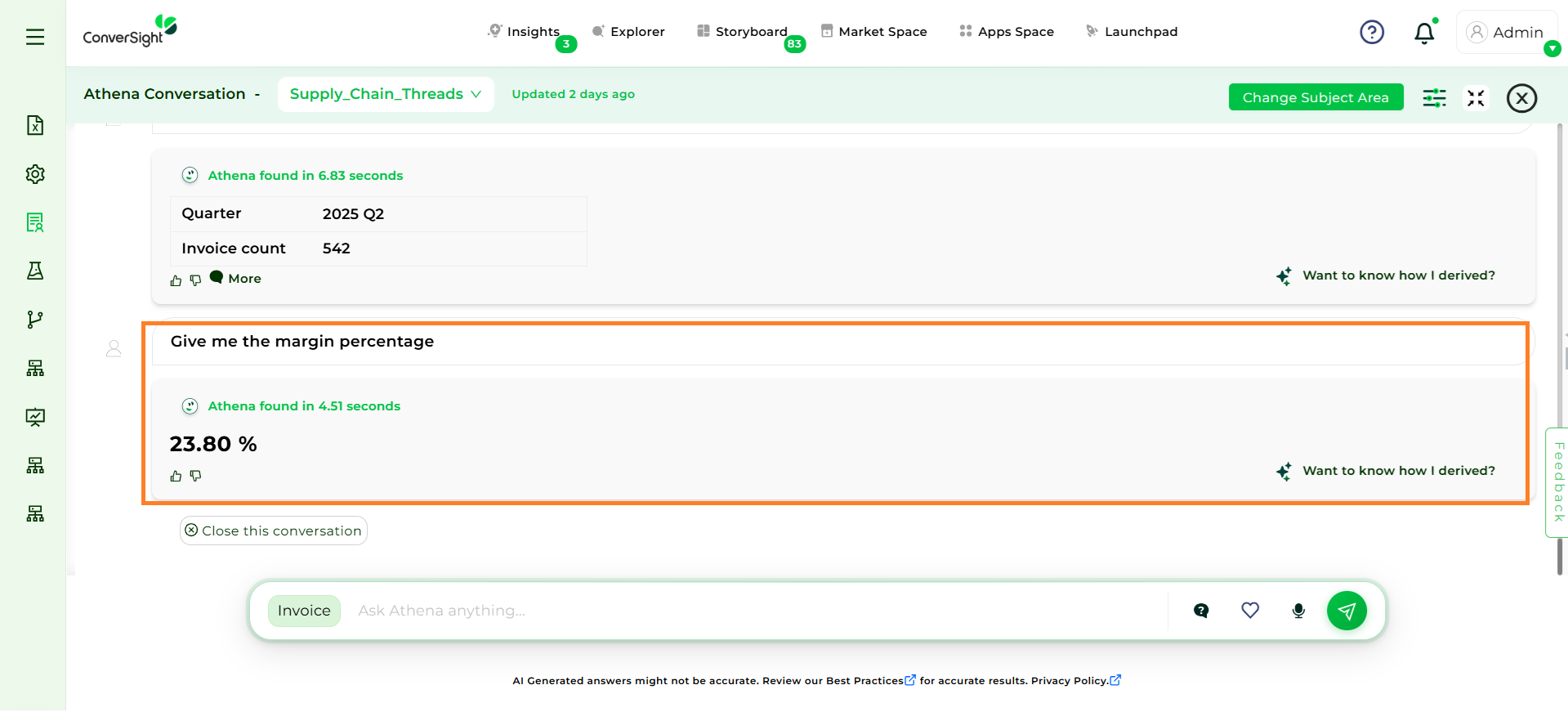 If schema doesn’t directly store profit margin, Athena can compute it whenever the user asks, “Show me profit margin by product”.