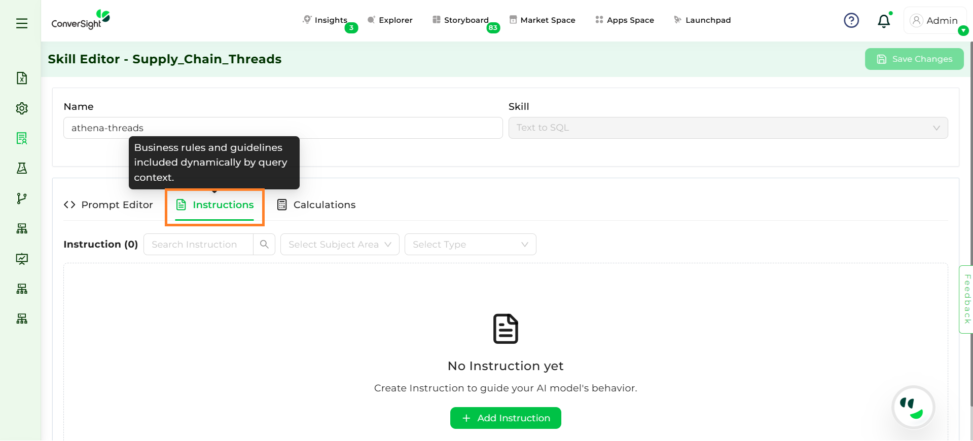 Instructions in the Skill Editor are rules or guidelines that direct Athena on how to interpret and respond to queries by adding domain-specific logic, business rules, or calculation guidelines, ensuring accurate, relevant, and context-aware answers across subject areas. Unlike template-level rules, these are dataset-level configurations that dataset admins can add, edit, or delete, offering flexibility through static or dynamic options to enforce business-specific logic without modifying templates.