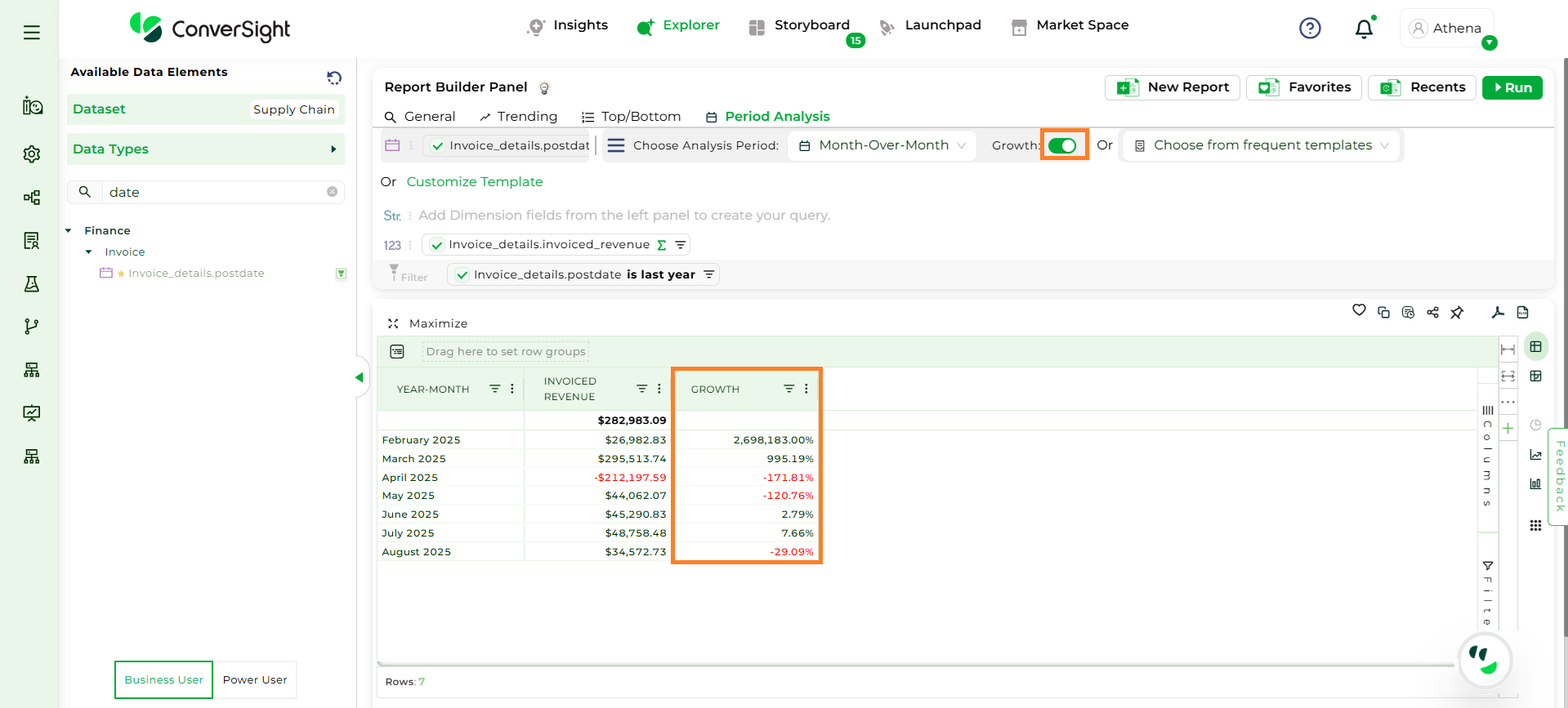 After selecting the Period-over-Period comparison, users can enable Growth Percentage, by enabling the Toggle, to view the percentage change between the selected periods. Automatically calculate the growth or decline of the selected metric, helping you quickly understand performance trends without manual calculations.