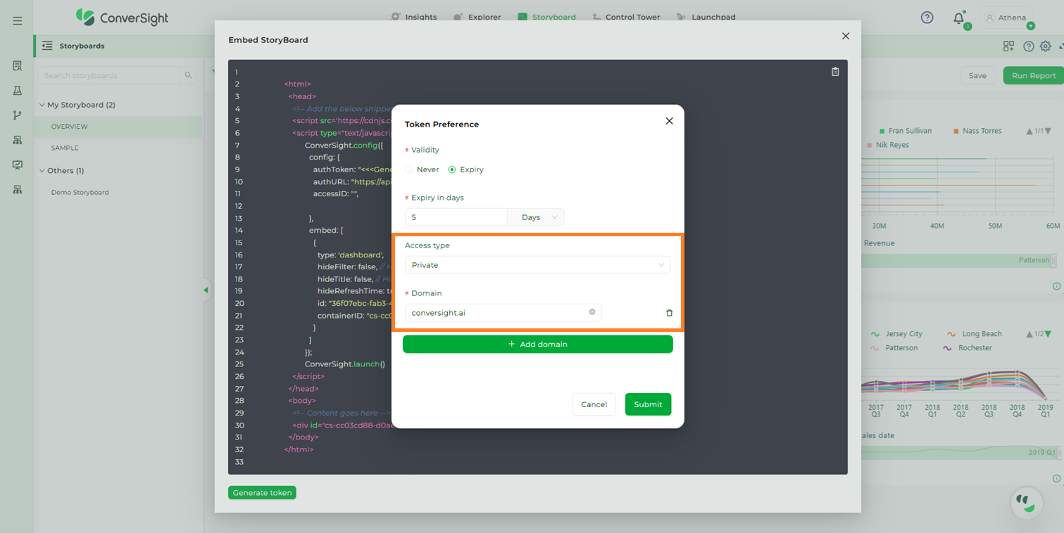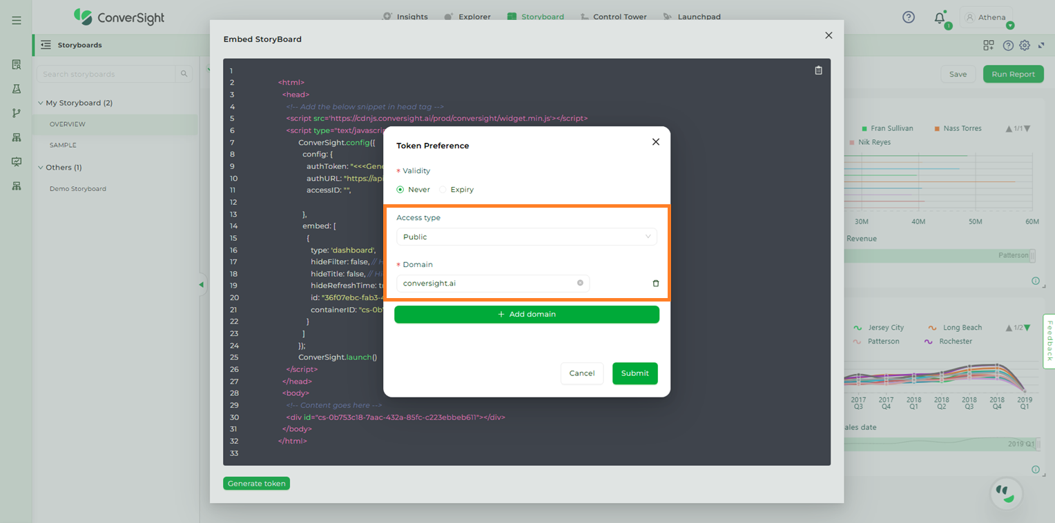 The Embed Storyboard feature proves highly beneficial in scenarios where an organization’s members prefer to utilize Athena within their own applications instead of accessing the ConverSight platform directly. By utilizing this feature, users can apply filters to restrict access, tailoring it to specific users and allowing them to conveniently access data from any location. This demonstrates their resourcefulness and problem-solving abilities in overcoming challenges.