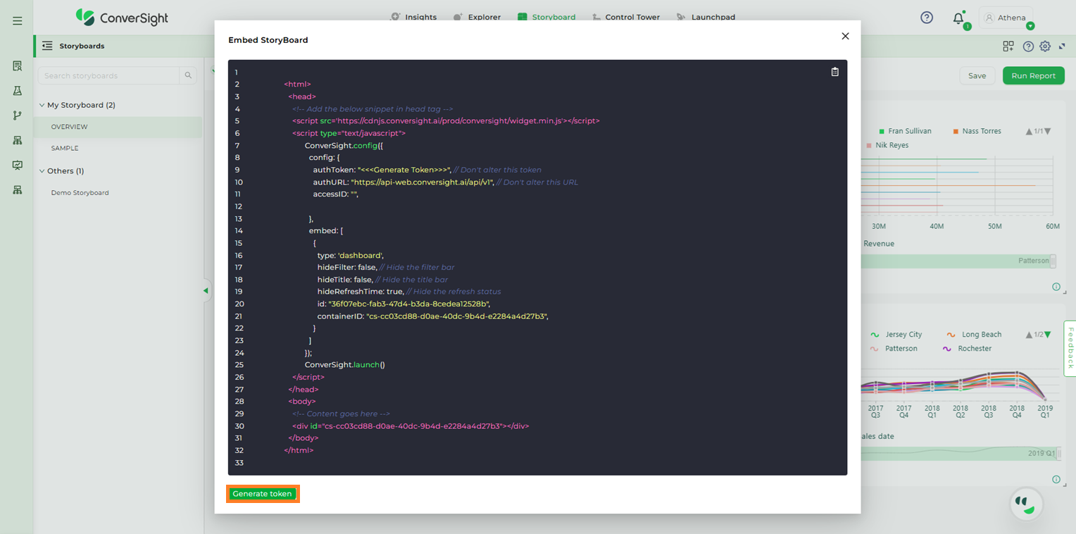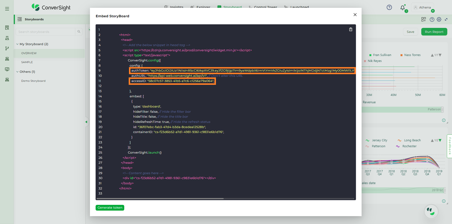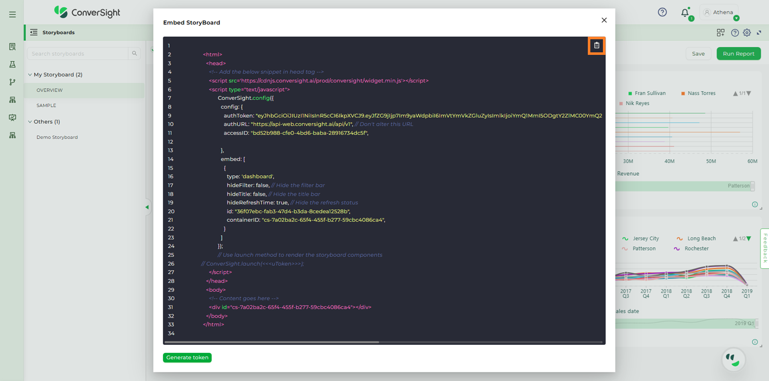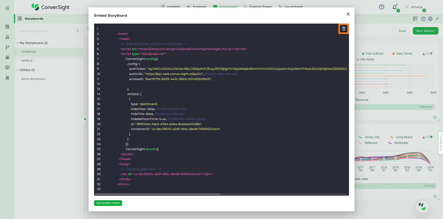 Step 2: Upon clicking the Embed Code option from the dropdown, a snippet for the Storyboard will be displayed. To proceed, click on the Generate Token option.