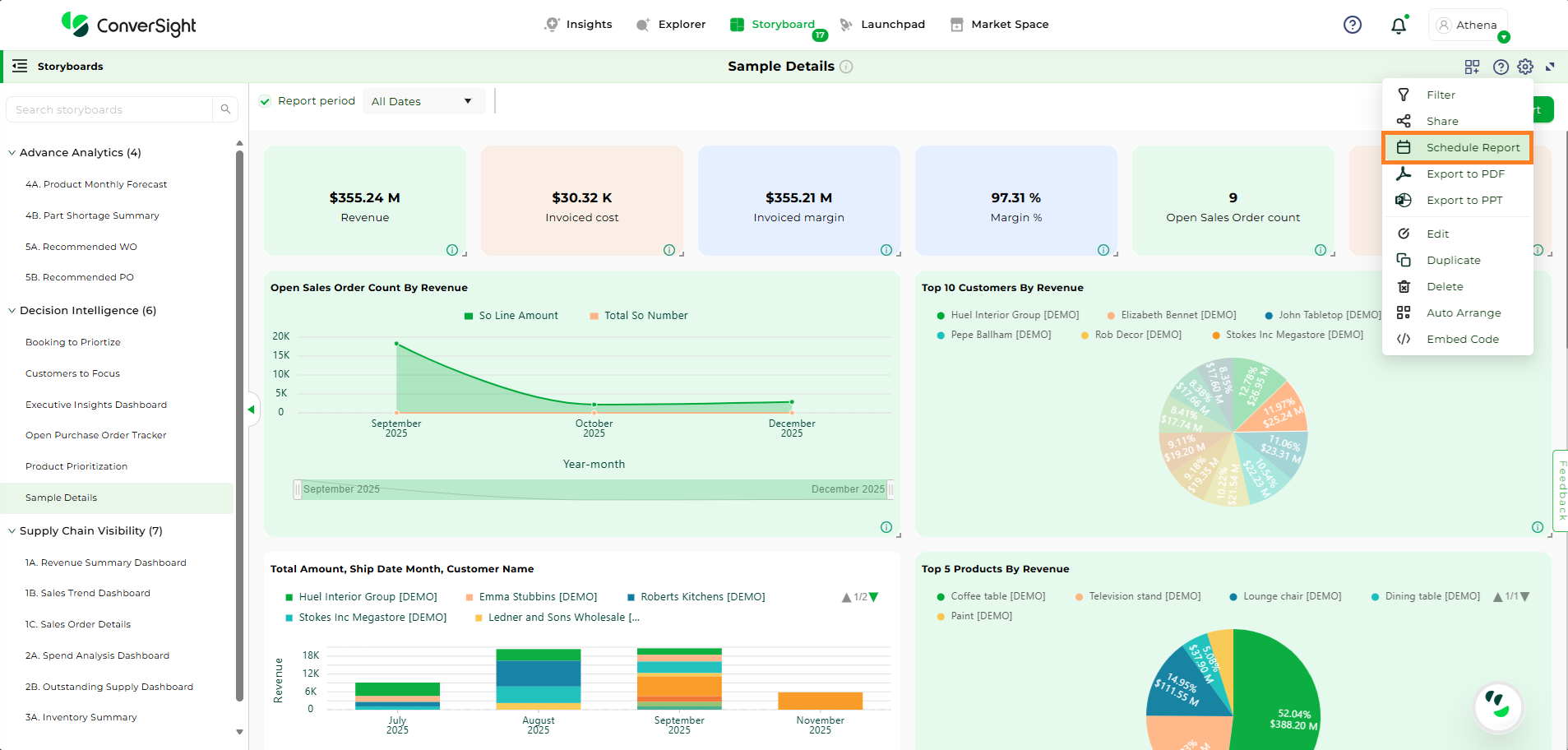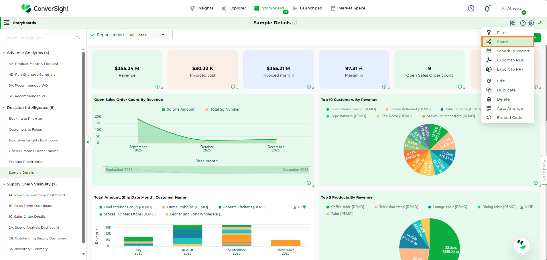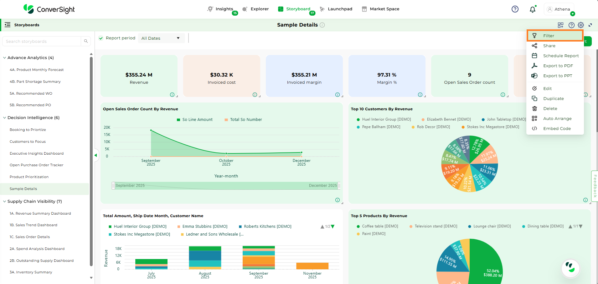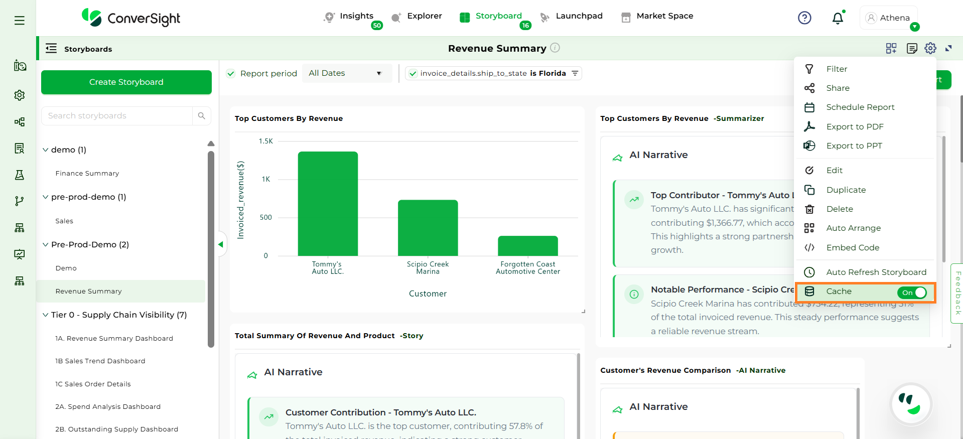 Click on Settings icon and select the Export to PDF option. In ConverSight, you can download the entire Storyboard in PDF format, so you can share it with people inside and outside your organization.