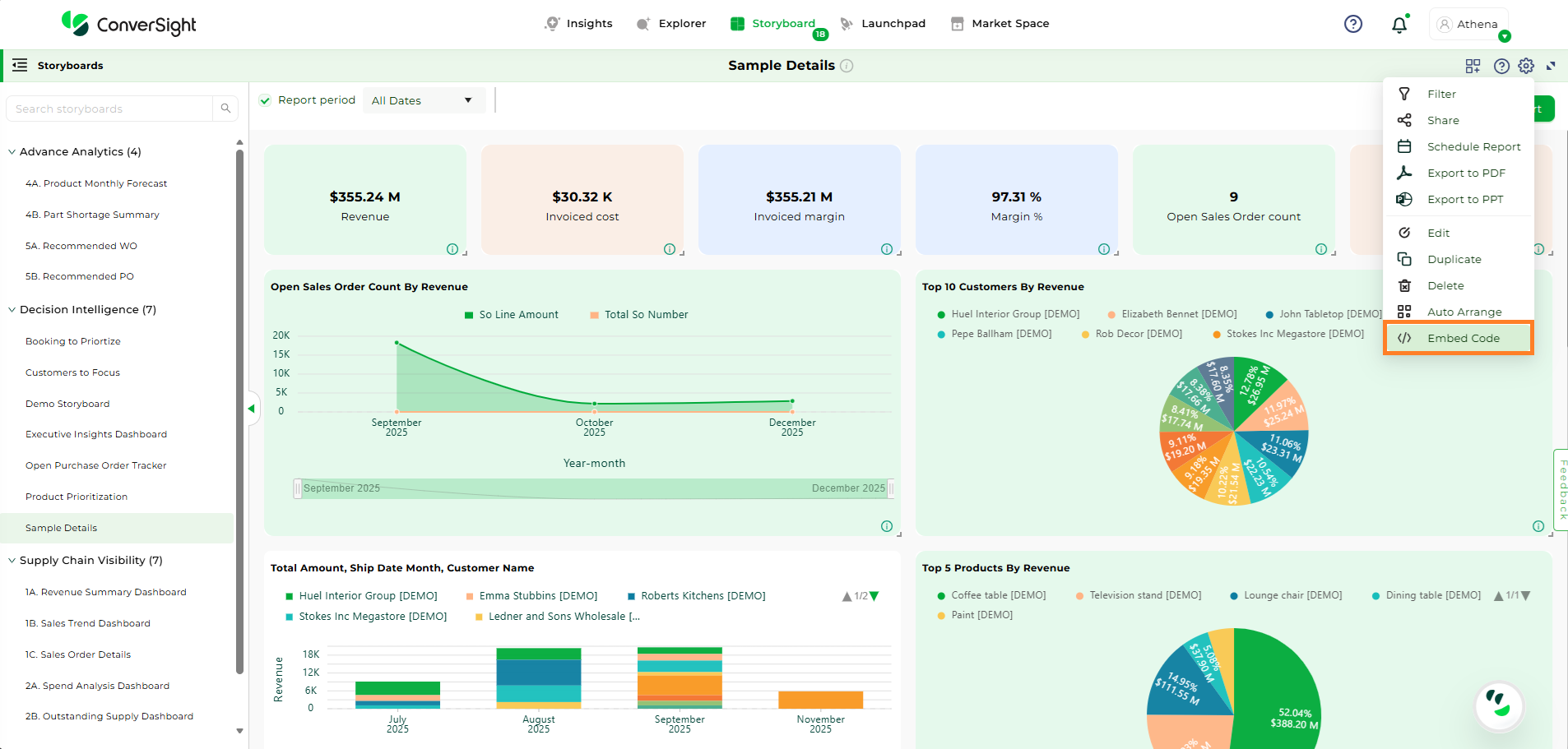 The Embed Code feature allows users to seamlessly integrate visual storyboards into internal or external applications. This enables users to access real-time insights directly within their own applications, without needing to log into the ConverSight platform. Organizations can apply filters and permissions to ensure that each embedded storyboard is securely tailored to the intended audience, making it easier to deliver data-driven narratives across departments or client-facing portals.