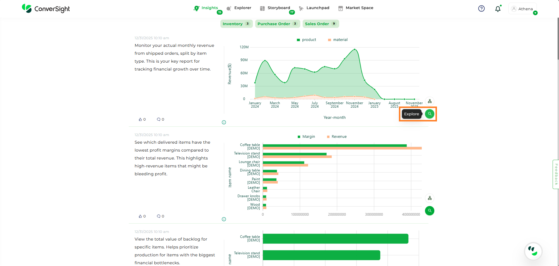 Your pinned insights will be displayed in a graphical representation, columns and tables.