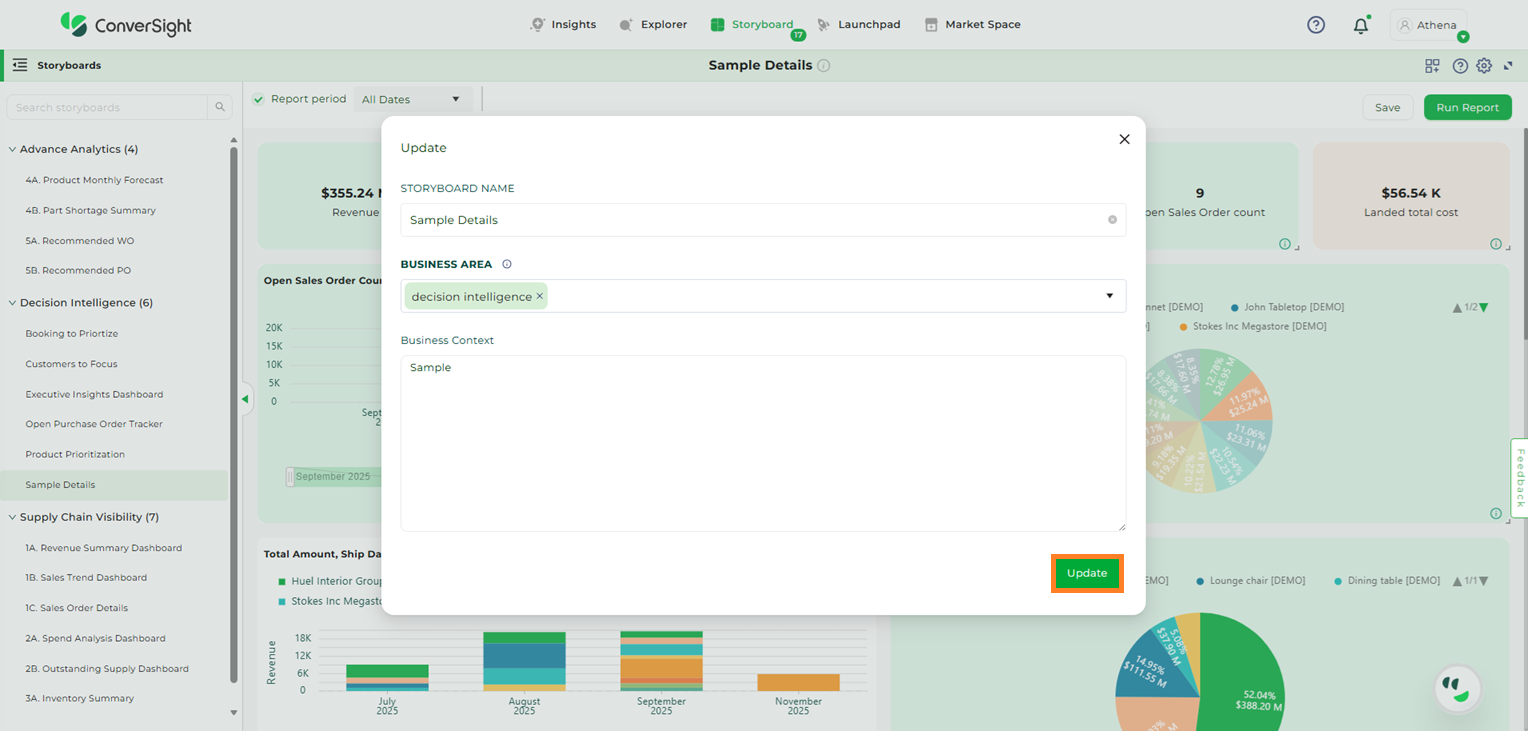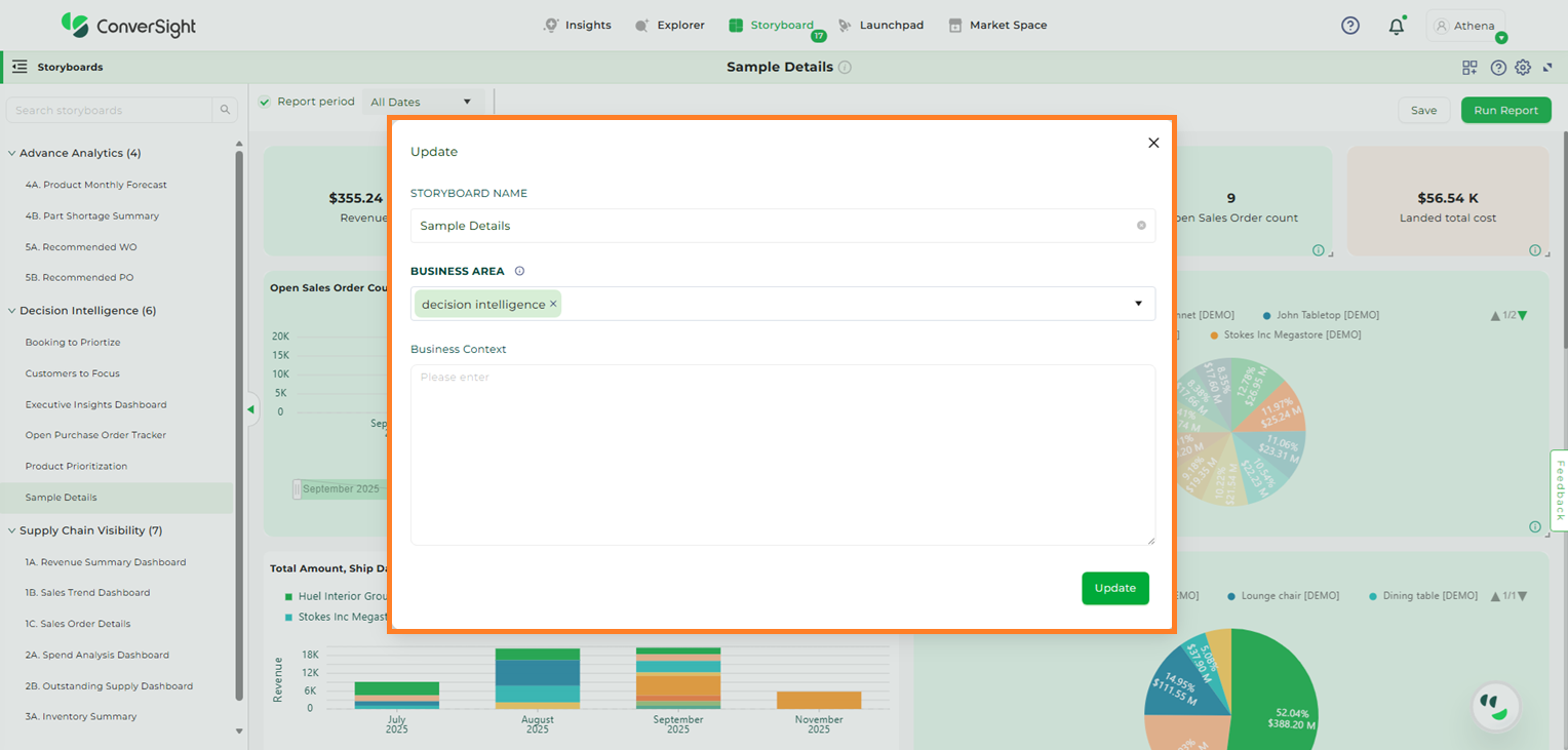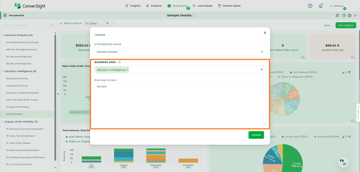 By clicking on the Edit icon, you can add a new Business Area to a storyboard. In addition to this, you can provide business context to give a clearer explanation. You can add more than one Business Area to the storyboard, allowing for a more detailed and organized presentation.