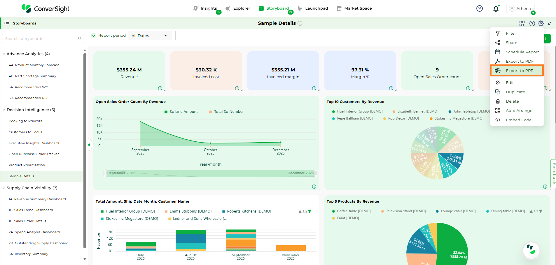 To generate a PowerPoint (PPT) version of your report, choose the specific storyboard and then click on the Export to PPT option. In ConverSight, you can download the entire Storyboard in PPT format, so you can share it with people inside and outside your organization.