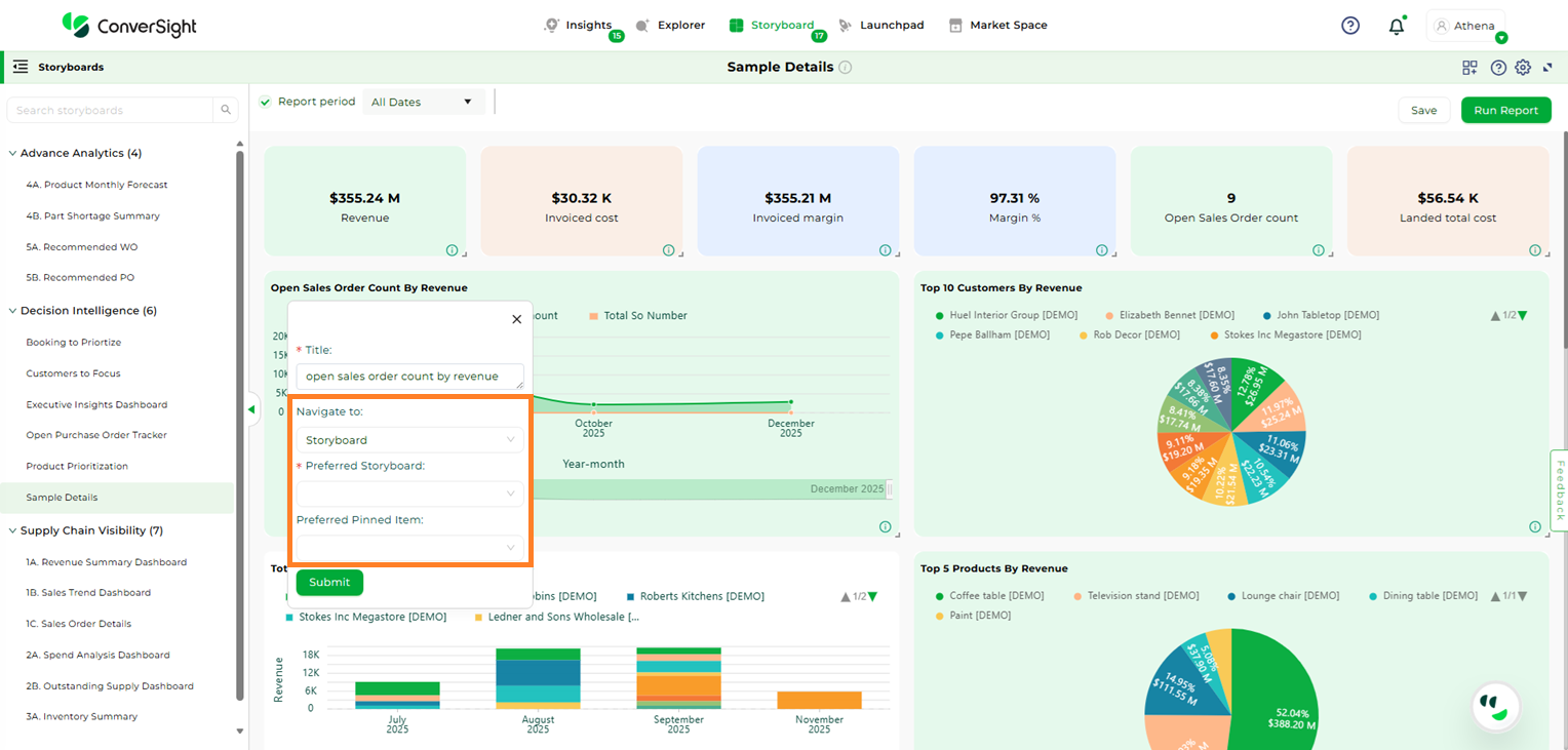 Opting for the Storyboard option allows you to establish a link to a pinned item within a Storyboard of your choice. When you click on the Storyboard’s title, it will lead you to the pinned Insight on the selected Storyboard’s page.