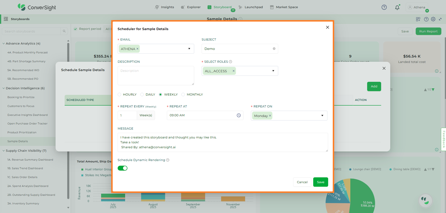 In the Scheduled Storyboard dialog box, you can add your email address as well as emails you would like to CC. You can set your schedule to daily or weekly and can also set your timings. Once you save your scheduled Storyboard, it will be sent to the recipient email with your set timings.