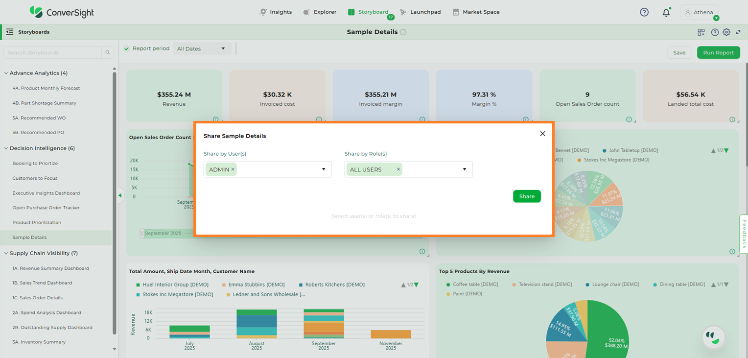 Usage of Storyboard You can pin charts and tables to any Storyboard you have created and those that have been shared with you with the edit privilege. When you create a Storyboard, you can share it with other people with either the view or edit privilege. Storyboard are interactive and allows you to perform actions like filtering, excluding values and drilling down on the visualizations.