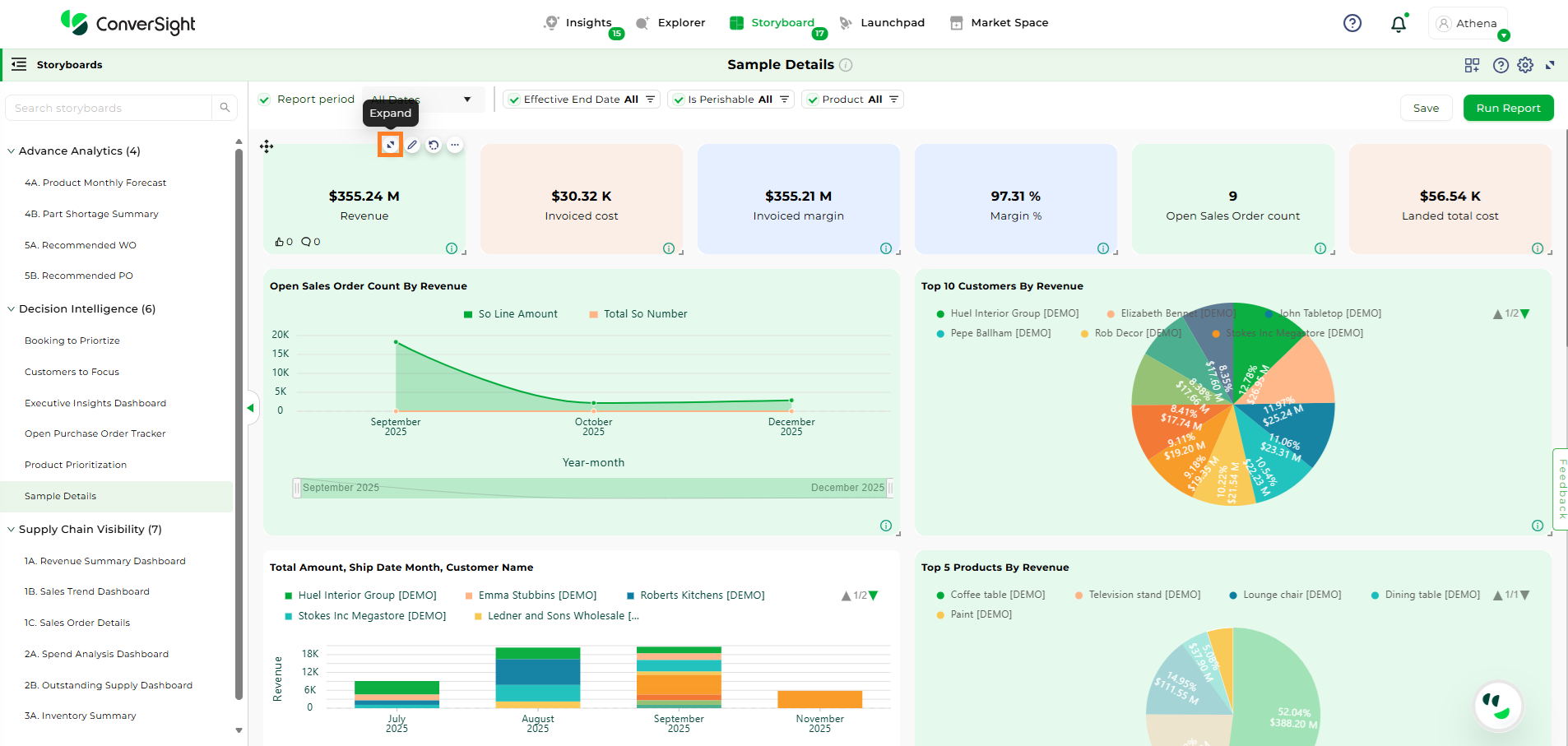 To apply this filter to all storyboard components, click the desired row in the filter component. You will then see the filter applied across all components in the storyboard, along with the specific filter details. In this example, the filter applied is Item Name is Coffee table.