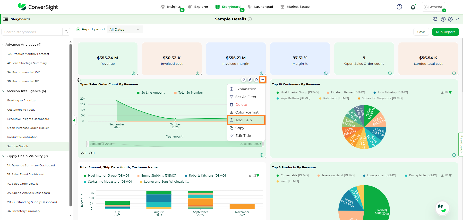 The Add Help option allows users to include supporting information or context to enhance the understanding of the insight.