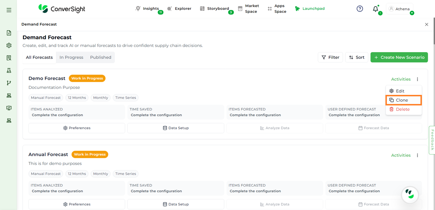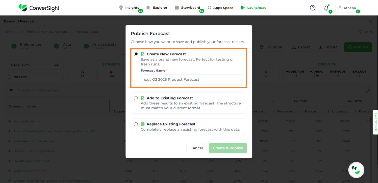 Built with flexibility and control at its core, this feature guides users through a structured forecasting journey. From configuring scenario preferences and selecting the right datasets to reviewing and adjusting projections, every step is designed for usability and impact. Users can create new forecasting scenarios, apply classification logic, fine-tune values and publish forecasts organization-wide—all within an intuitive interface. Whether you’re refining forecasts manually or using AI Demand Forecast models, the platform gives you complete visibility and control.