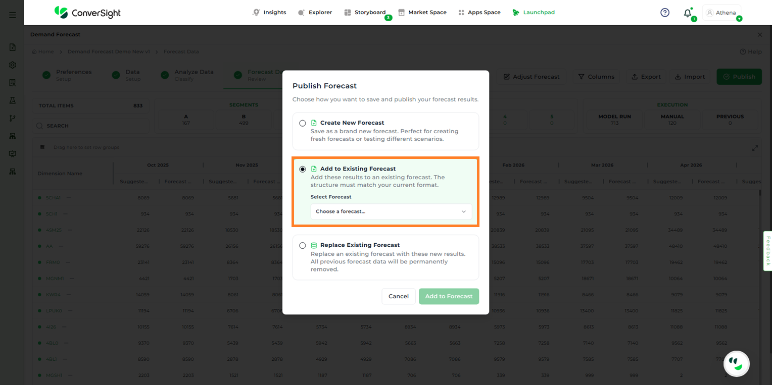 Add to Existing Forecast – Appends the results of the current forecast to an existing one. Users must select the target forecast from the dropdown list.