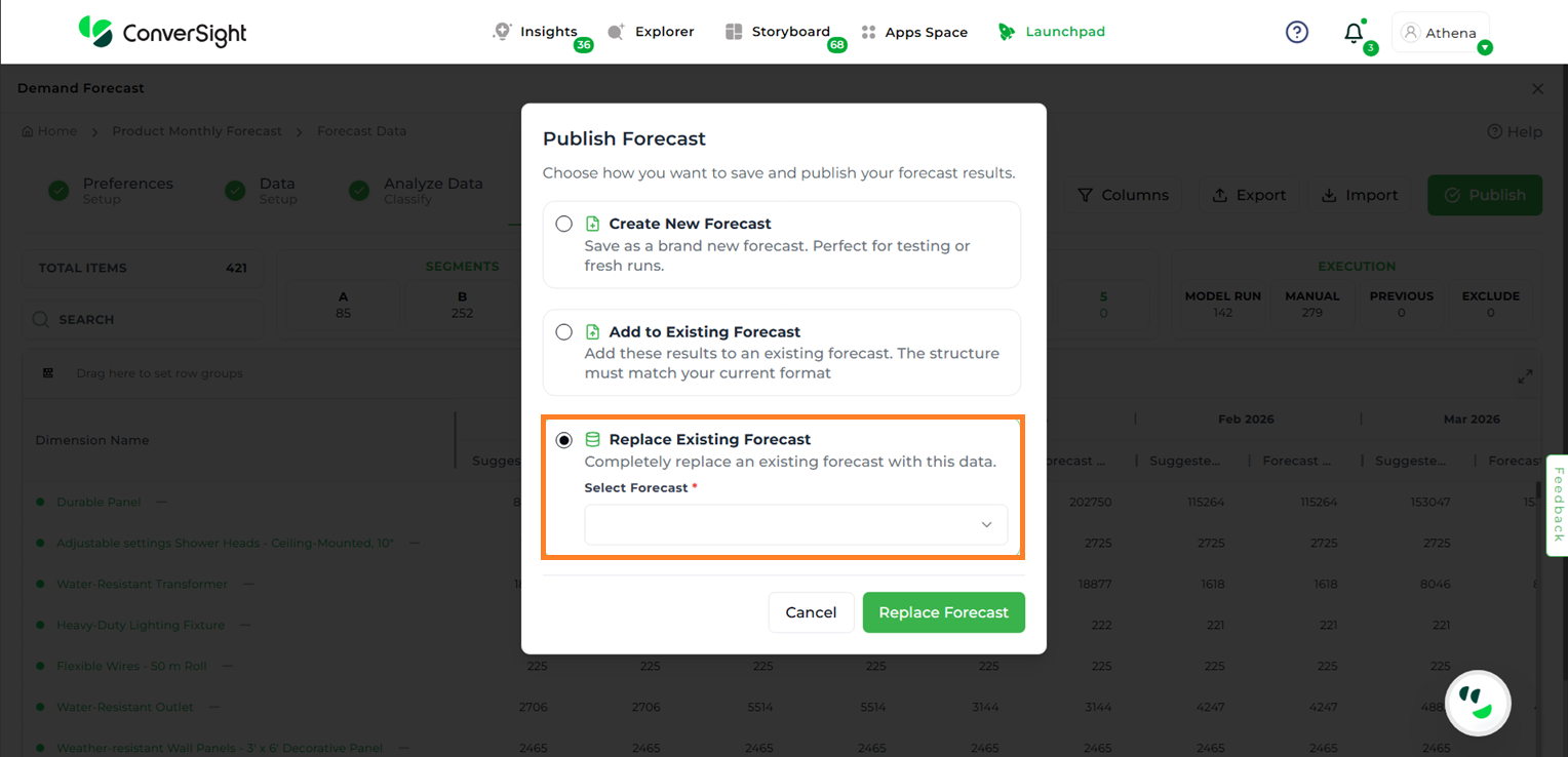 Replace Existing Forecast – Replaces an existing forecast entirely with the new results. All previously stored forecast data will be permanently deleted.