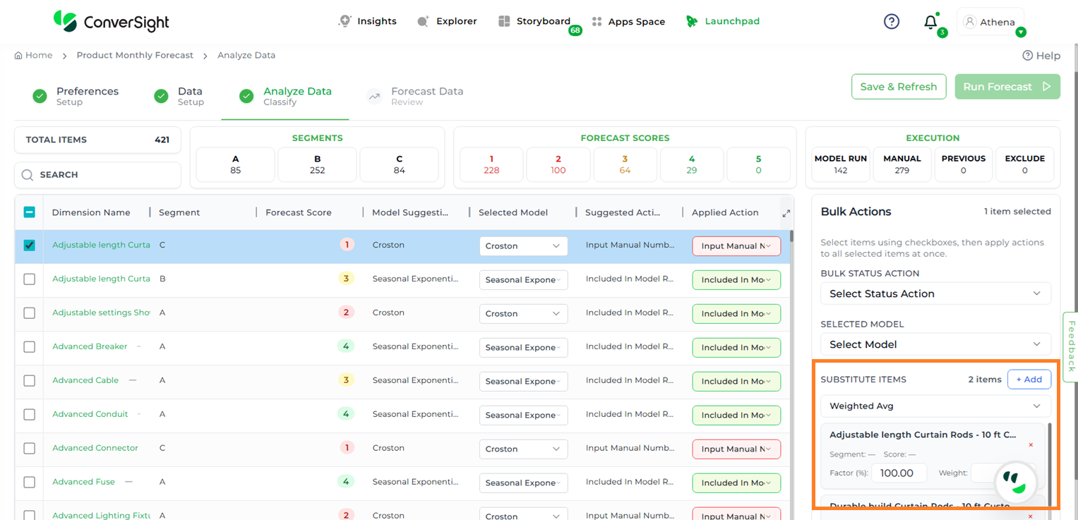 Once a substitute item is added, it will appear in the Bulk Actions section under the Substitute Items option. Users can also apply a scaling factor and weight to the added item, adjusting it as needed to align with specific business requirements.