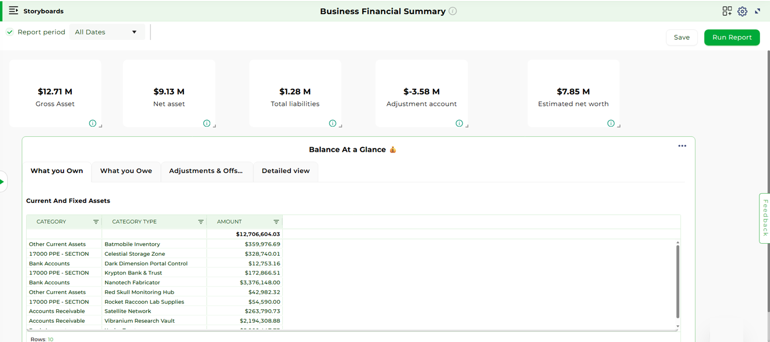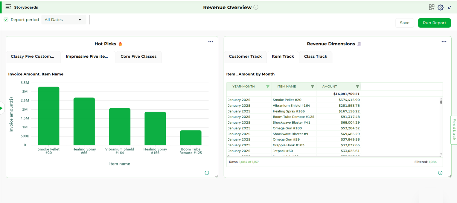 These storyboards provide powerful insights across various business functions, helping users track performance, optimize financial operations, and make data-driven decisions.
