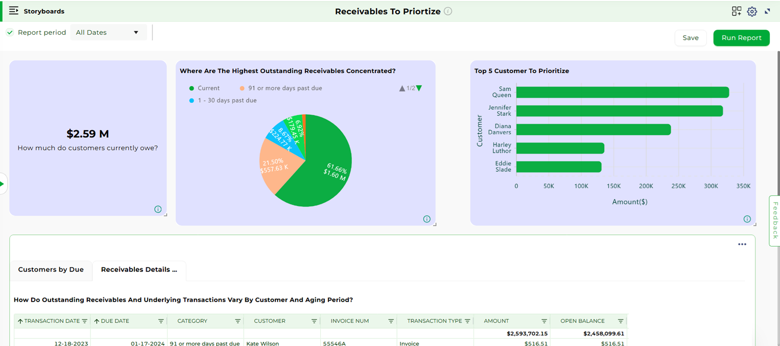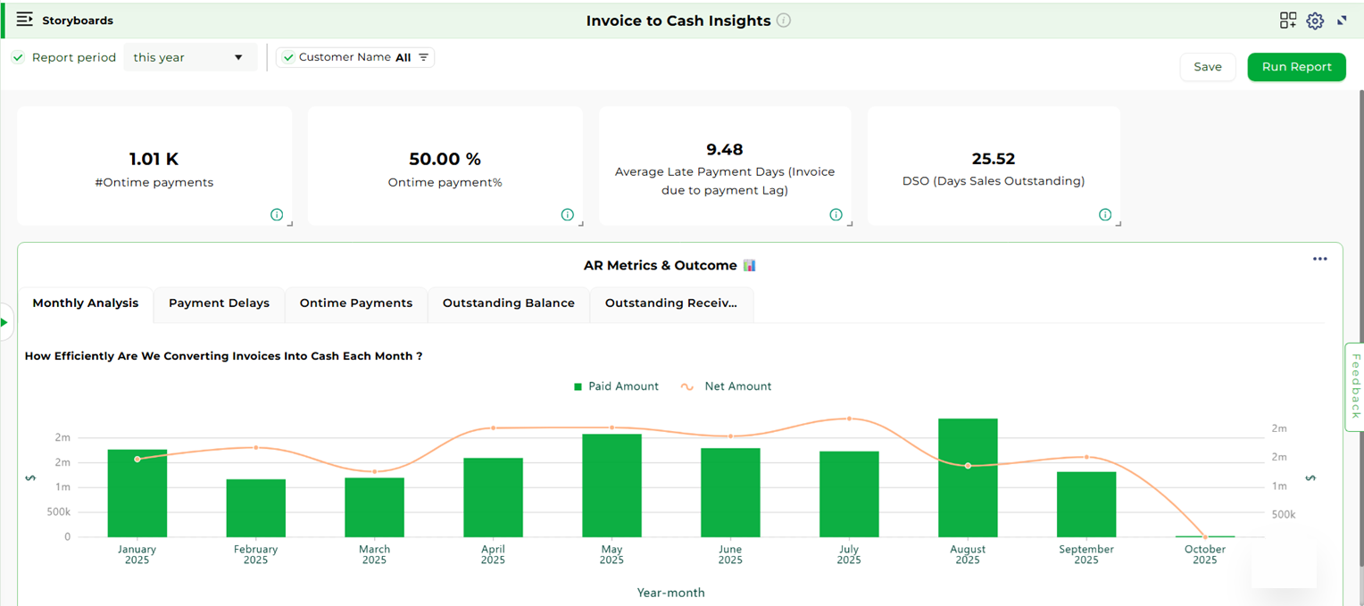 The Invoice Collections storyboards help finance teams manage accounts receivable, monitor collection efficiency, and identify growth opportunities.