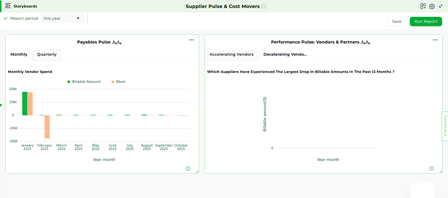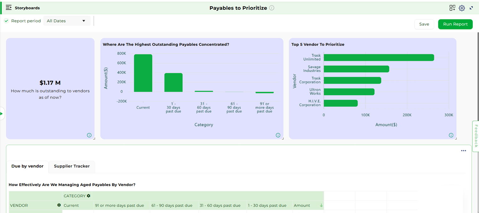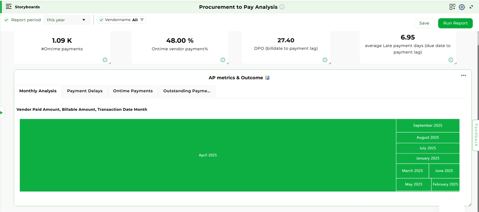 The Procurement and Payables storyboards offer a comprehensive view of supplier management and cash outflows, ensuring cost efficiency and timely vendor payments.