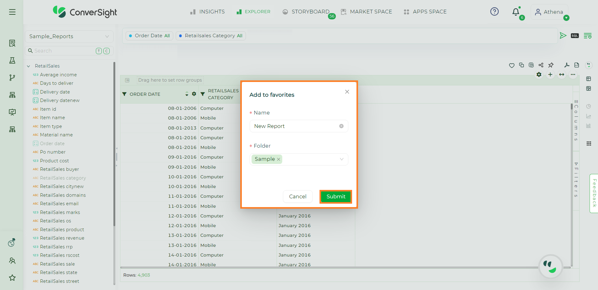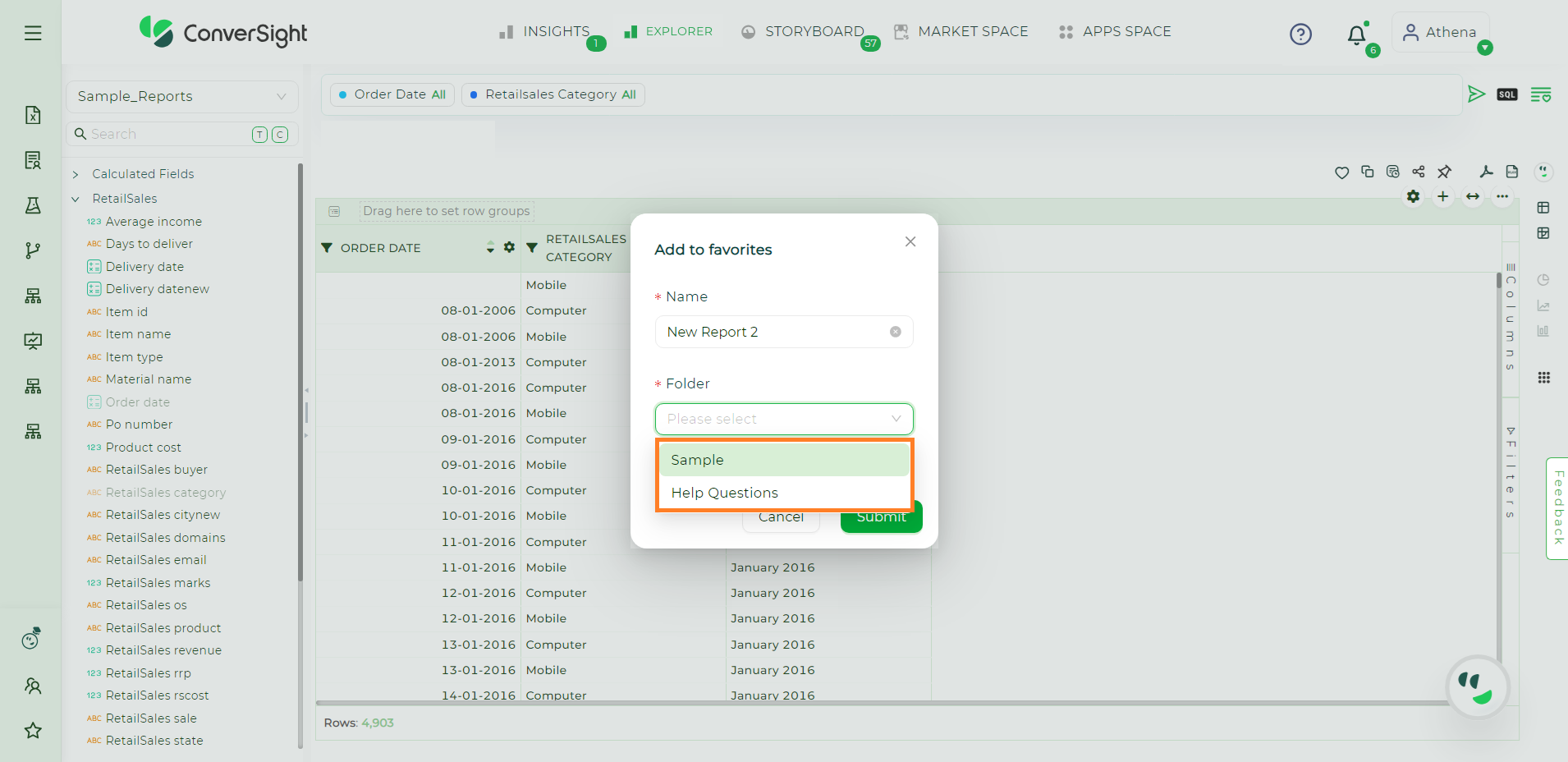 Selecting the Add to Favorites option triggers a dialog box to appear, enabling users to input the name and choose the folder from the dropdown menu for the Report to be added to favorites.