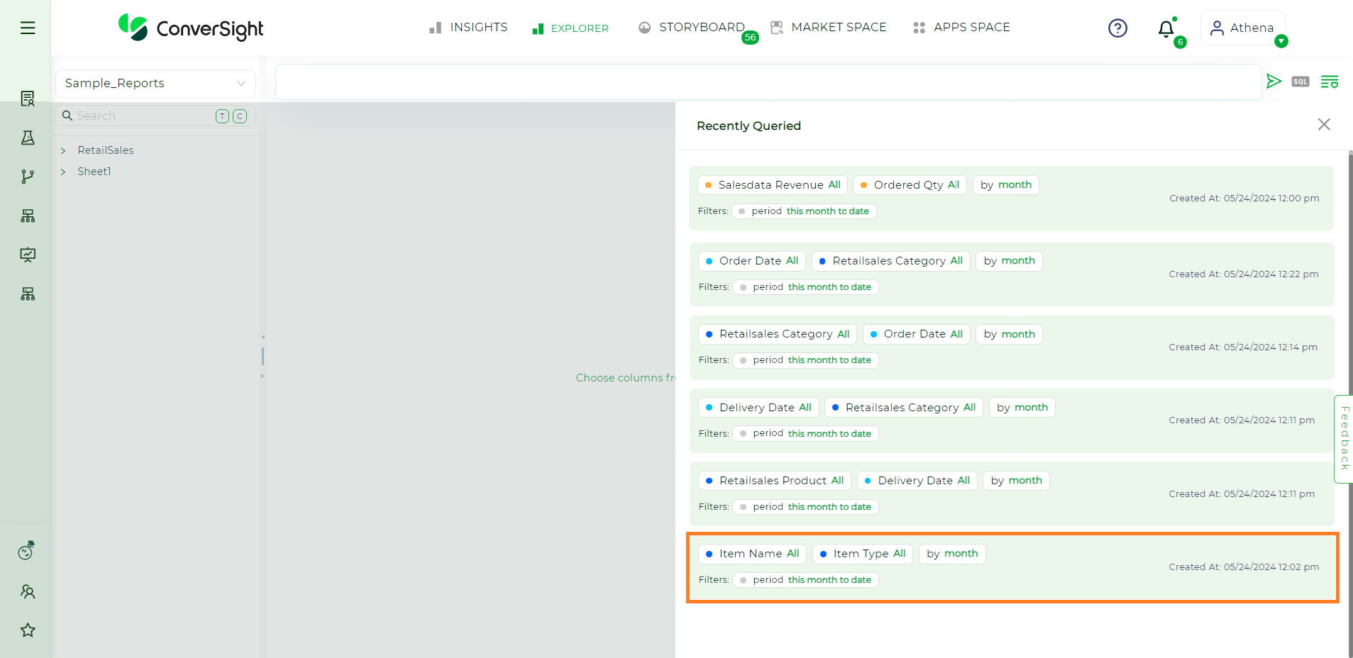 The Recently Queried dropdown in the query interface enables users to view their recently executed reports. By selecting any query from the dropdown menu, users can effortlessly revisit previous reports.