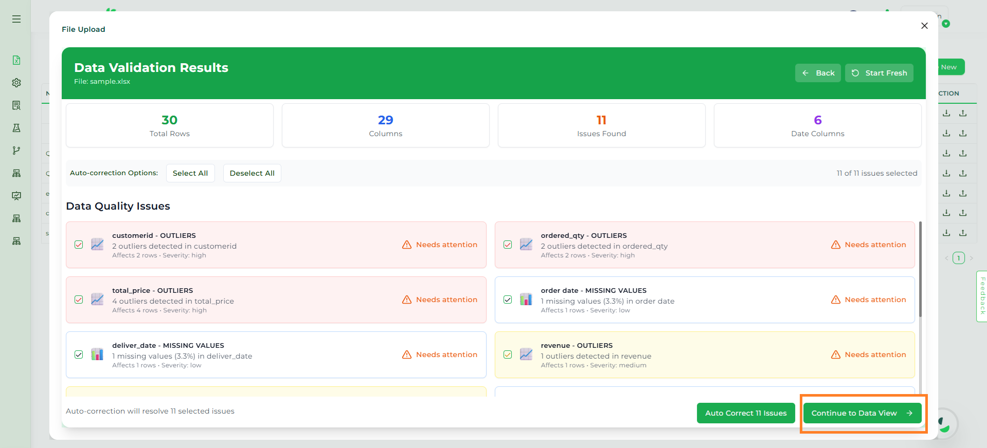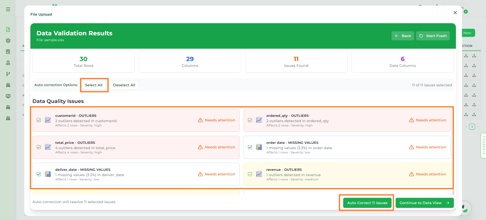 If any issues are present, they are listed clearly under Data Quality Issues. To fix the issues automatically, select the issues with the Select All button and click the Auto Correct Issue button.
