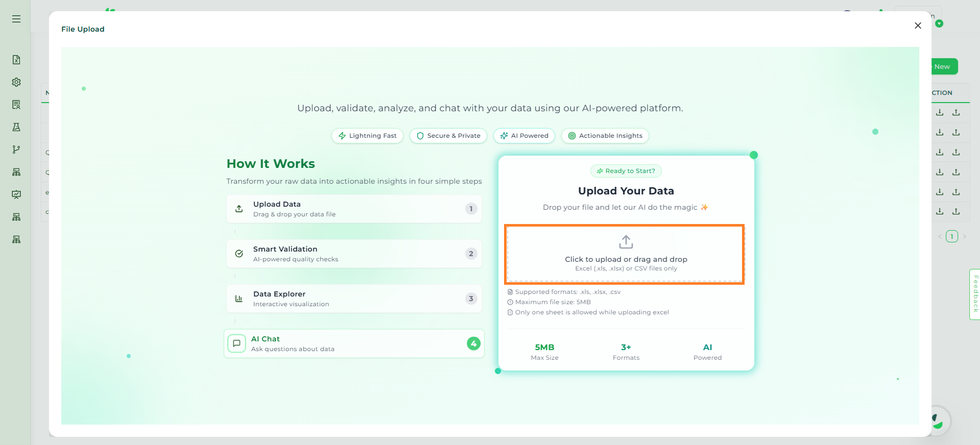 AI Chat: Query the validated dataset via AI Chat to get insights, quick reports, and interactive exploration.