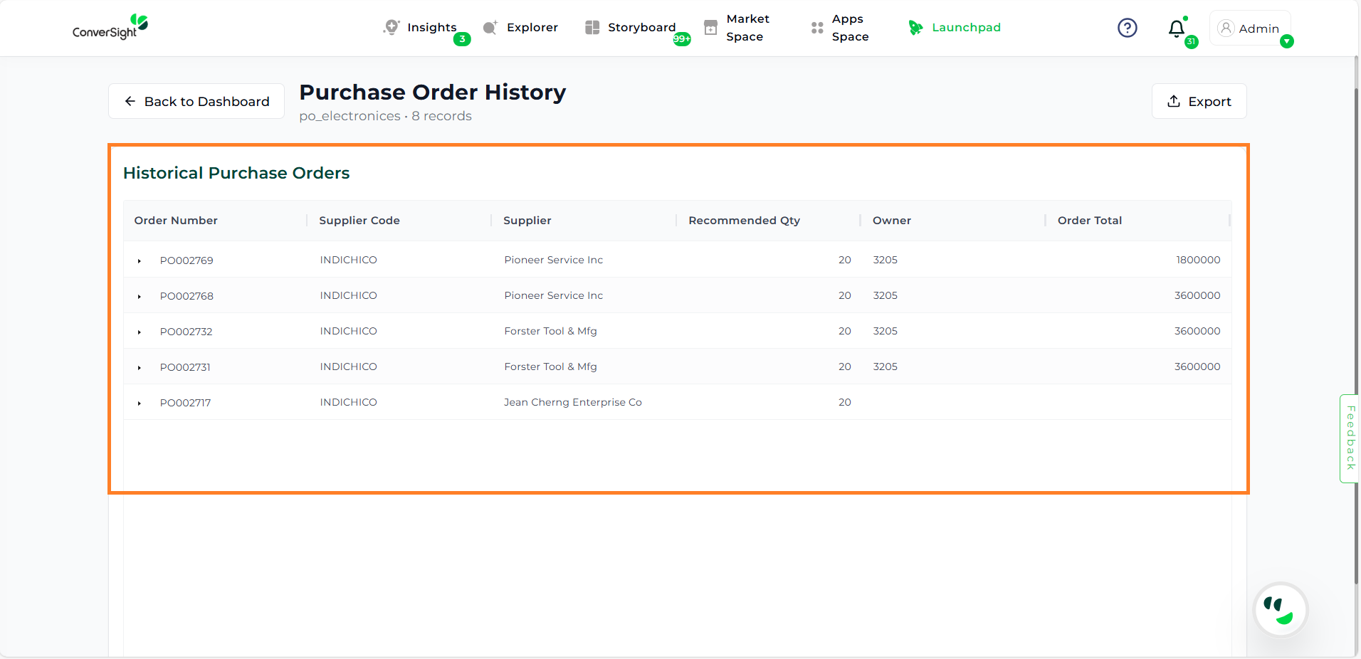 The Review Purchase Order History displays a list of purchase orders along with key details such as Order Number, Supplier Code, Supplier, Recommended Order, Owner, and Order Total, allowing users to easily track and review order information.