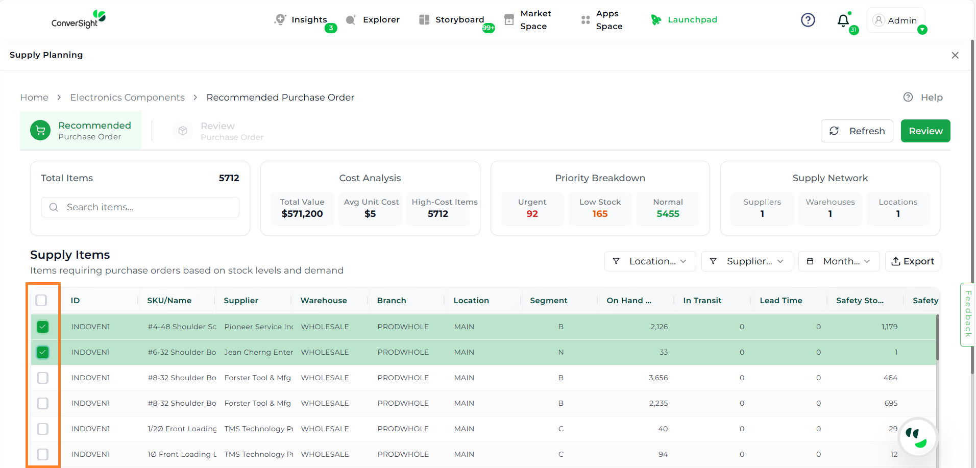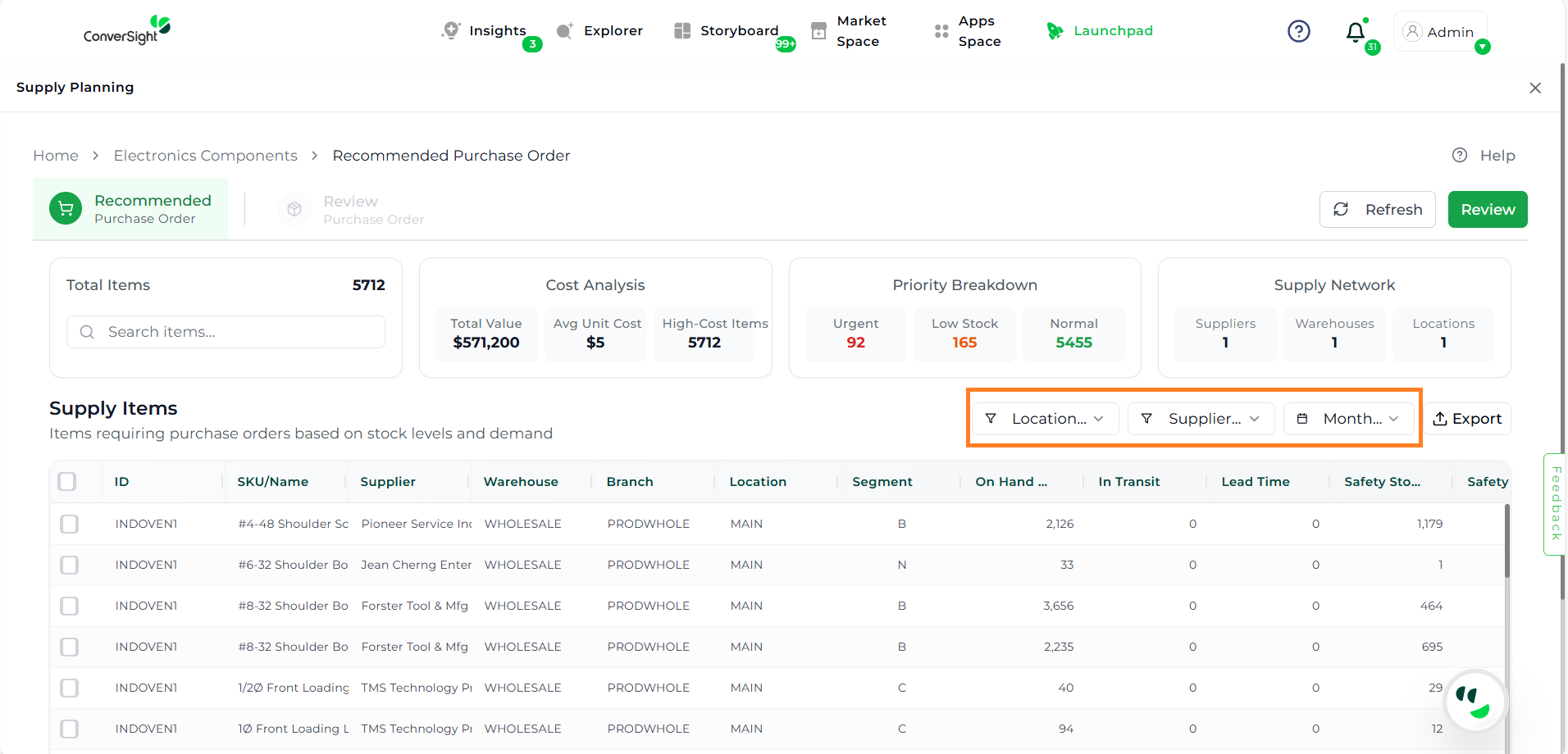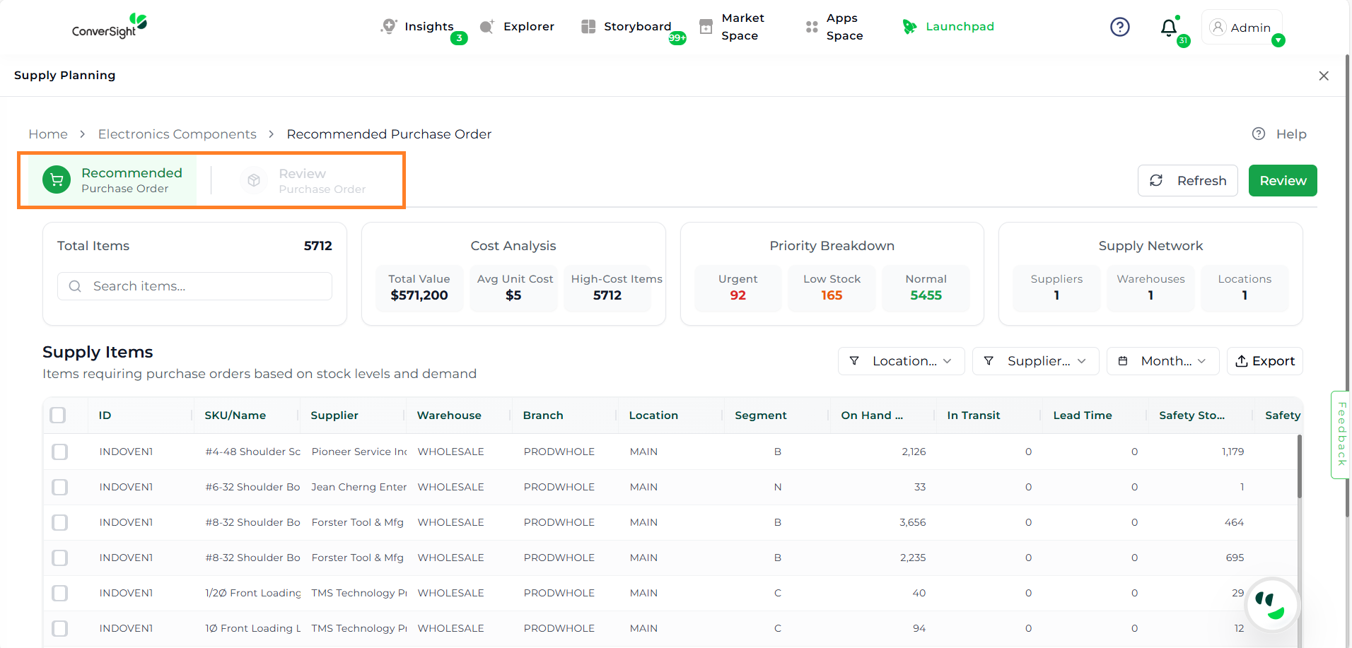 The Recommended Tab is your primary workspace for analyzing inventory needs. It helps users evaluate items based on demand, cost, and risk of stockouts.
