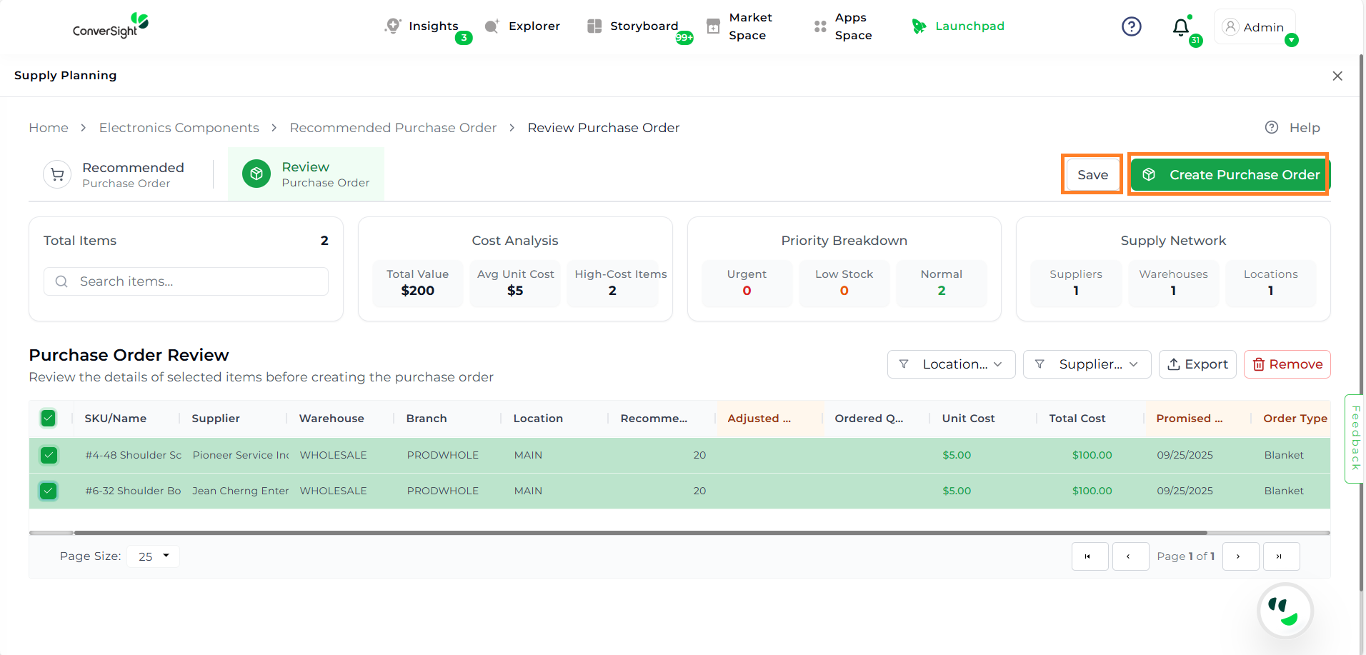 Make any necessary edits to quantities, dates, or order type, then click Save to finalize the PO. To create the PO, select the items by checking their boxes, and finally click Create Purchase Order.