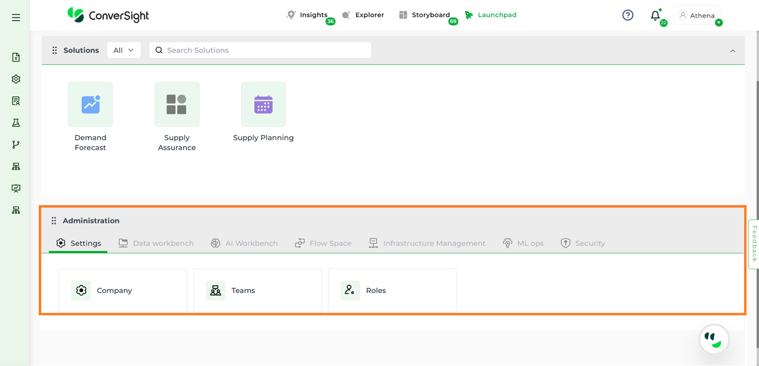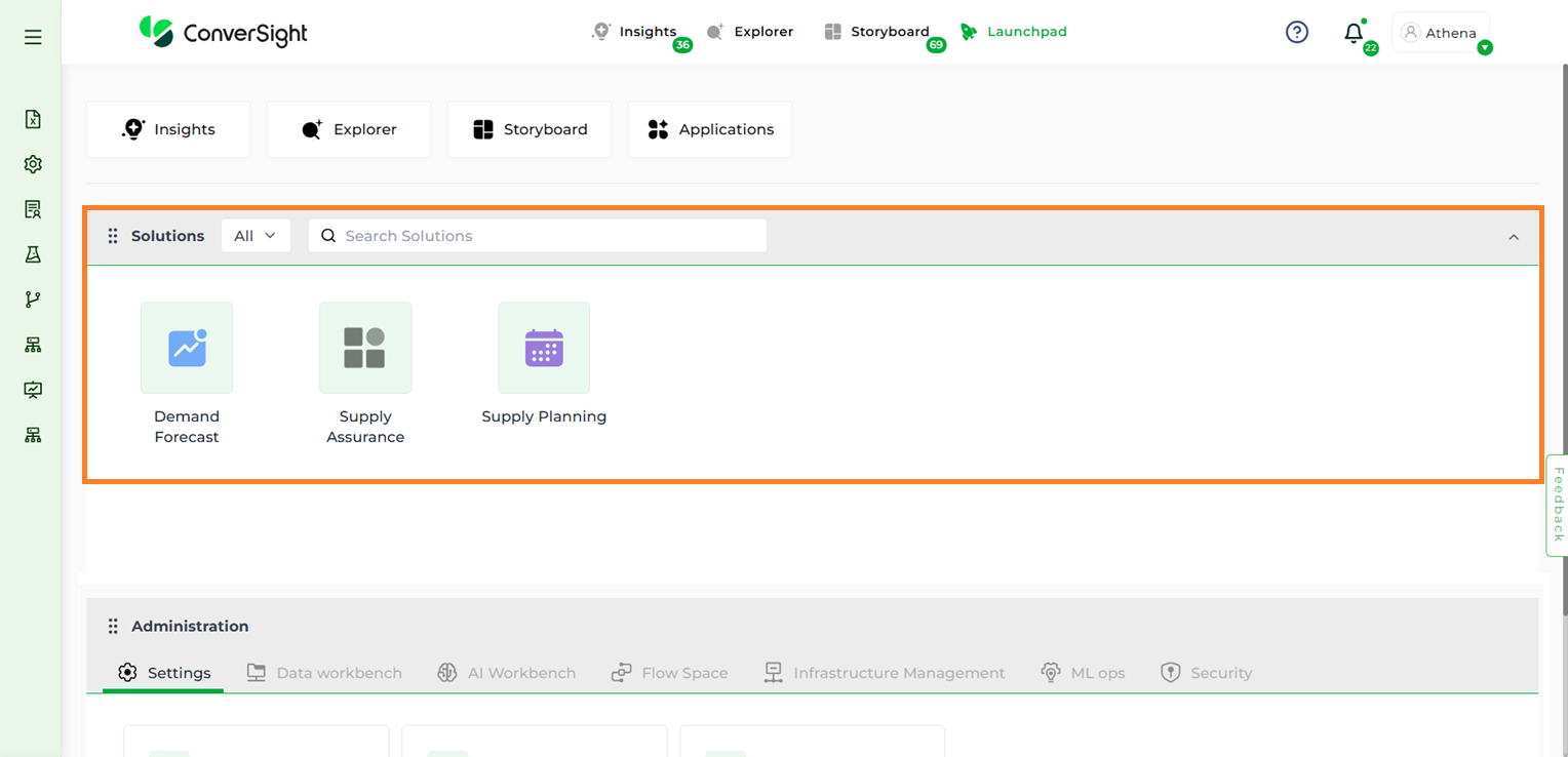 Launchpad in ConverSight is a unified workspace that brings together all key platform features and applications into one organized and accessible screen. It serves as the central navigation point for users, providing direct access to core capabilities such as Insights, Explorer, Storyboard and Market Space.