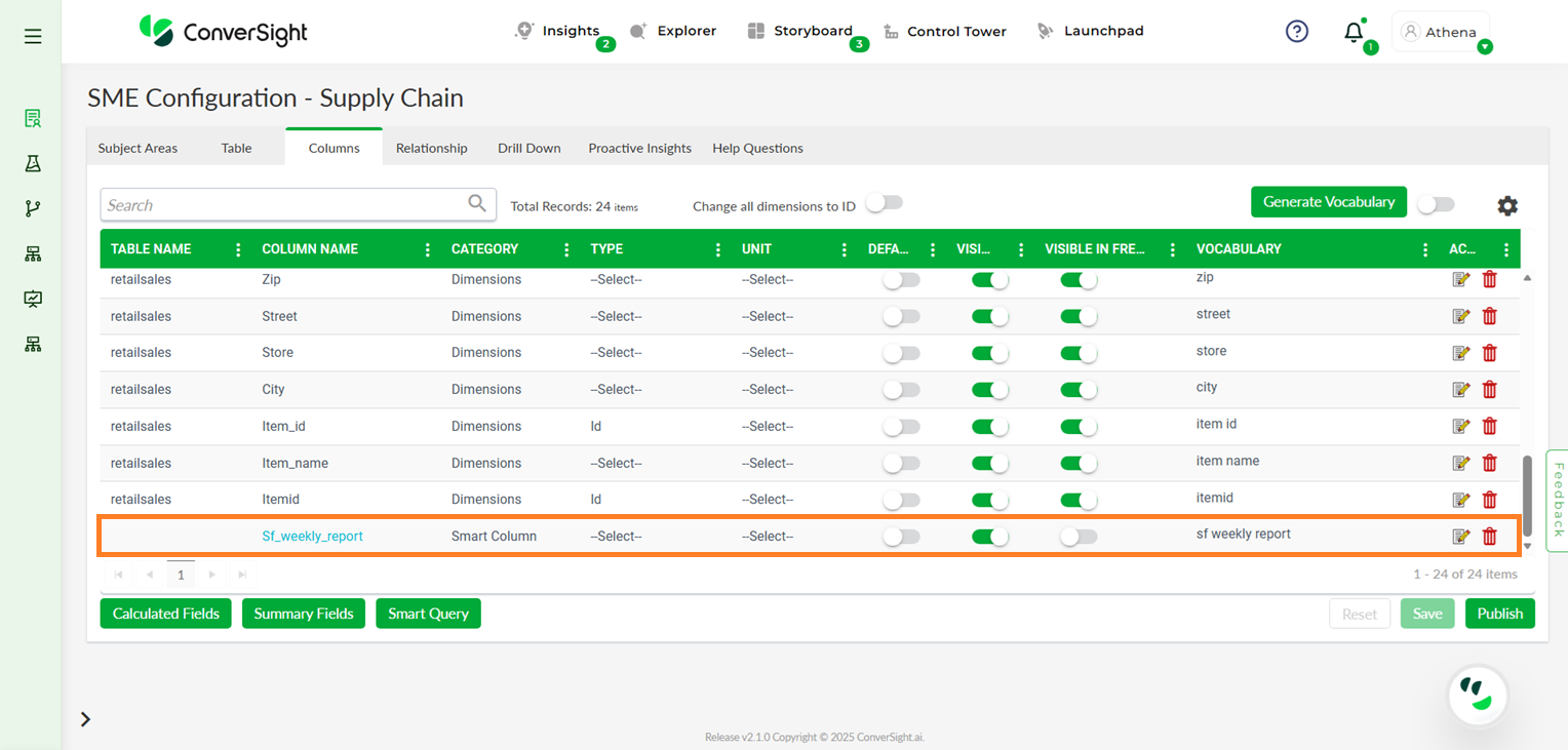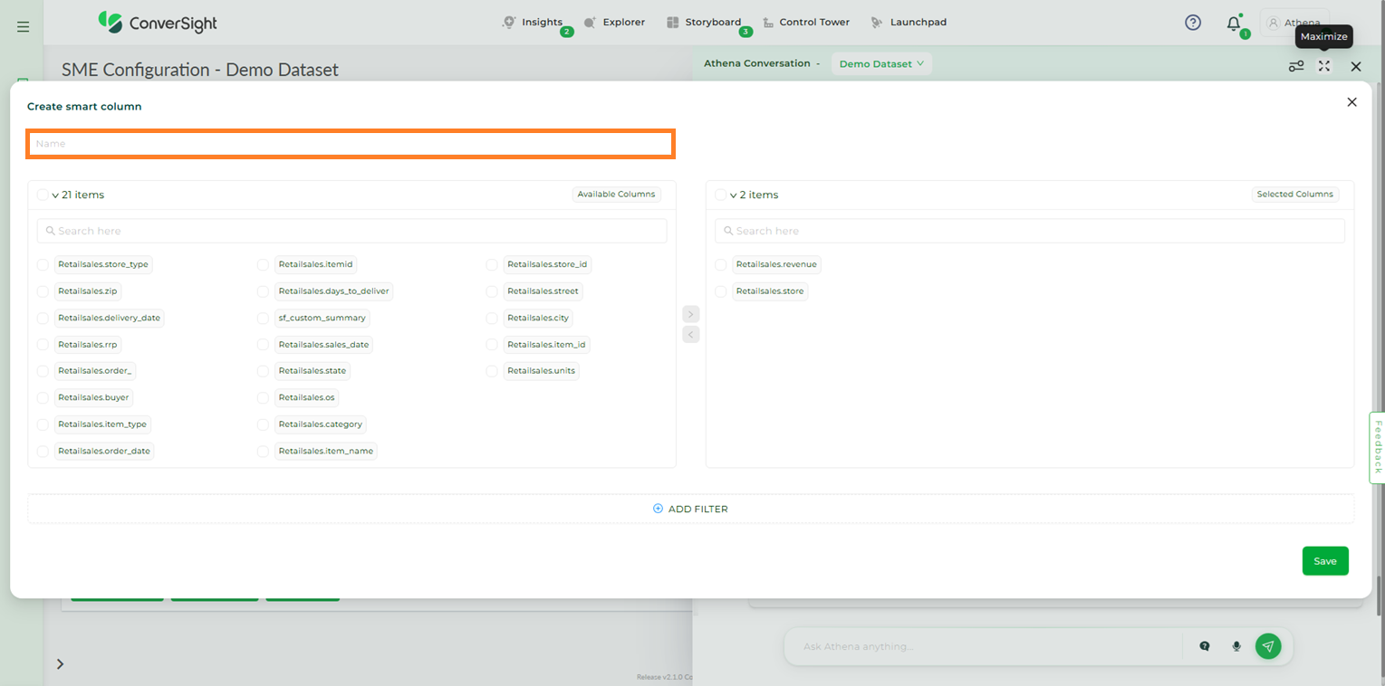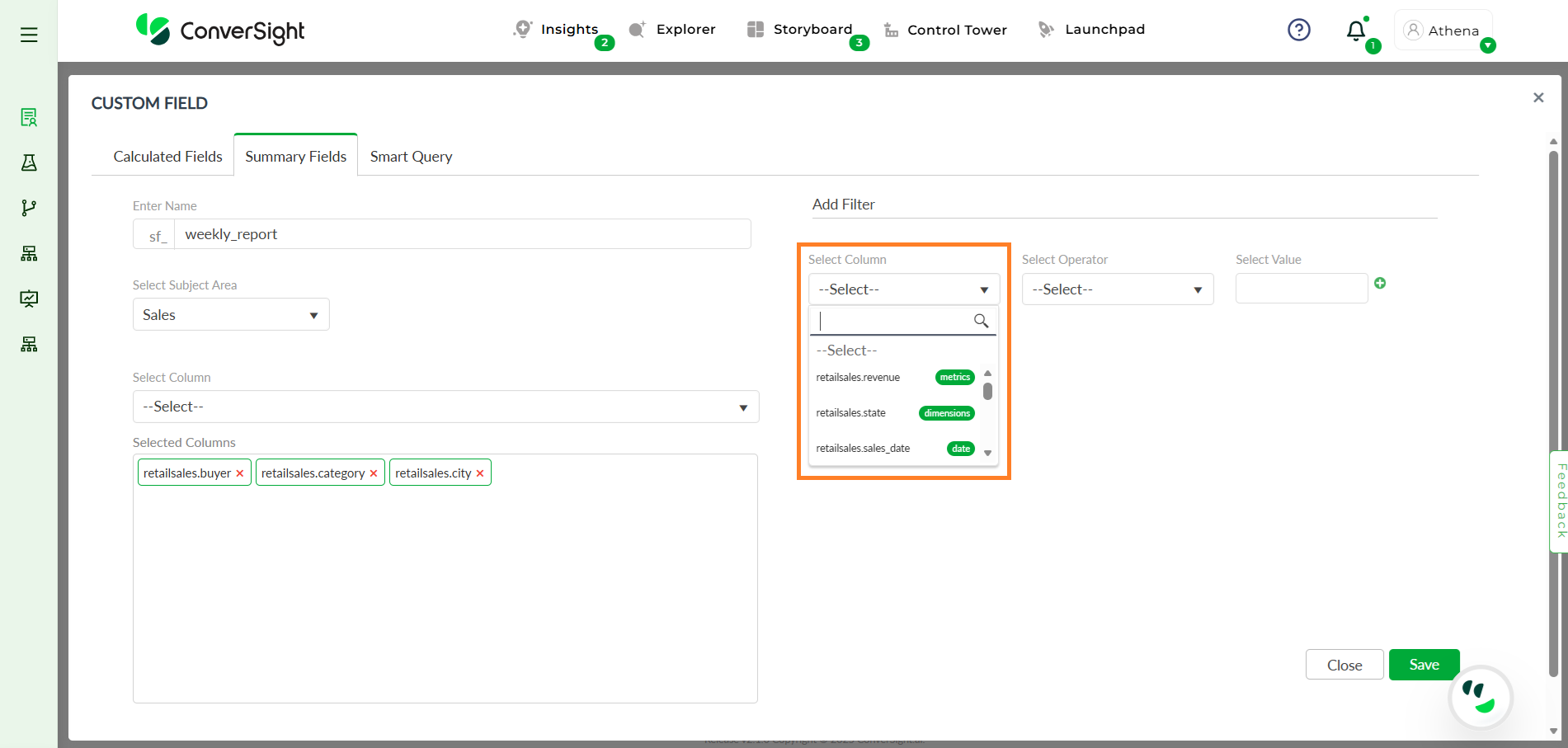 Summary Fields are used to create Smart Columns that serve as a crucial feature for users requiring report generation or validation of inputs across multiple columns in a dataset. However, with the utilization of Smart Columns, users can conveniently consolidate necessary columns, name the query and save it for future use. This functionality streamlines the retrieval of grouped columns in Athena, significantly saving time and effort. The created Smart Column will exclusively exist within the platform and won’t be replicated in the actual database.