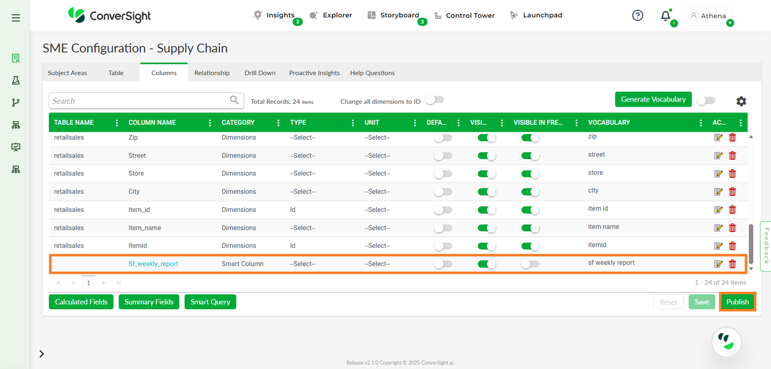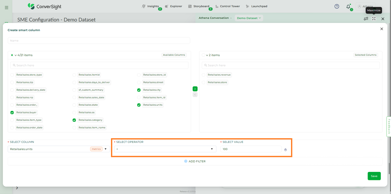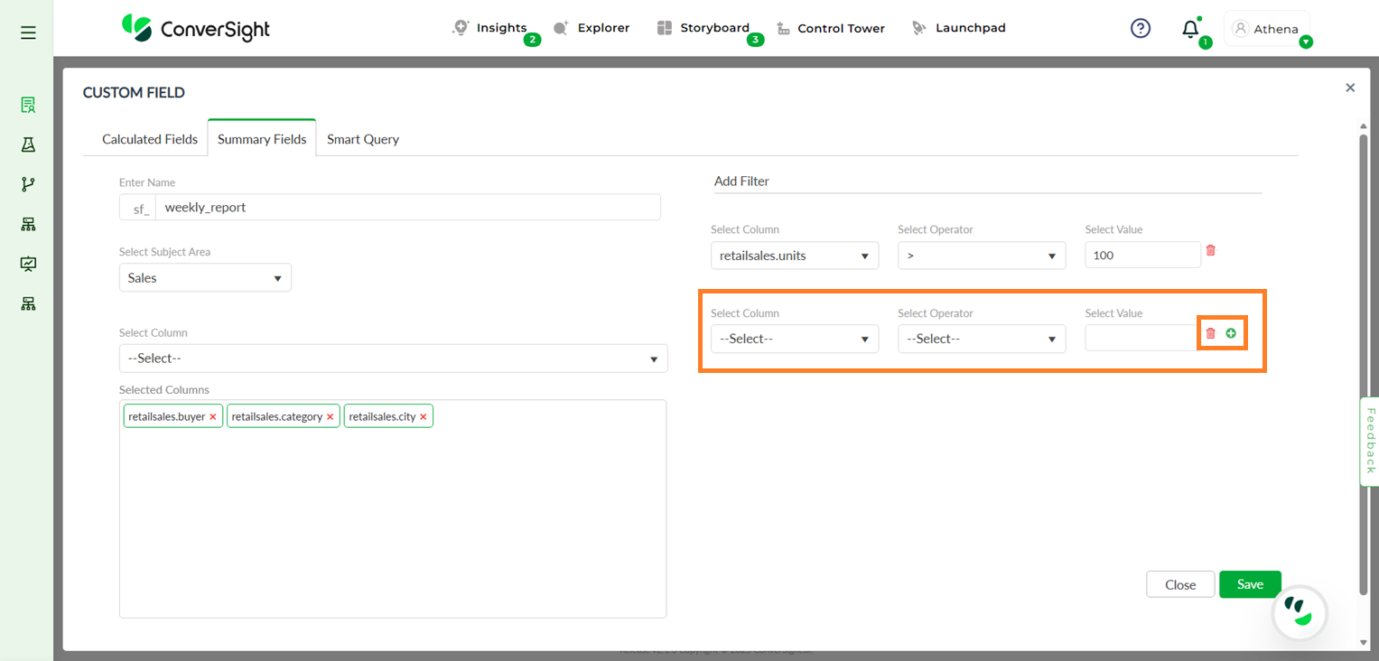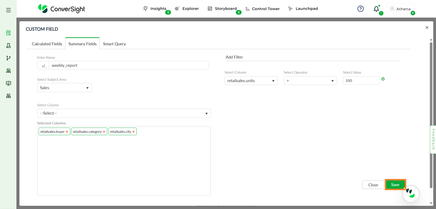 Summary Fields are used to create Smart Columns that serve as a crucial feature for users requiring report generation or validation of inputs across multiple columns in a dataset. However, with the utilization of Smart Columns, users can conveniently consolidate necessary columns, name the query and save it for future use. This functionality streamlines the retrieval of grouped columns in Athena, significantly saving time and effort. The created Smart Column will exclusively exist within the platform and won’t be replicated in the actual database.