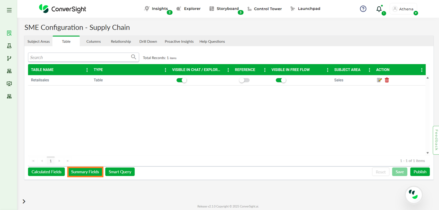 Step 3: Upon reaching the SME Coaching page, click on the Table tab and then choose the Summary Fields button.