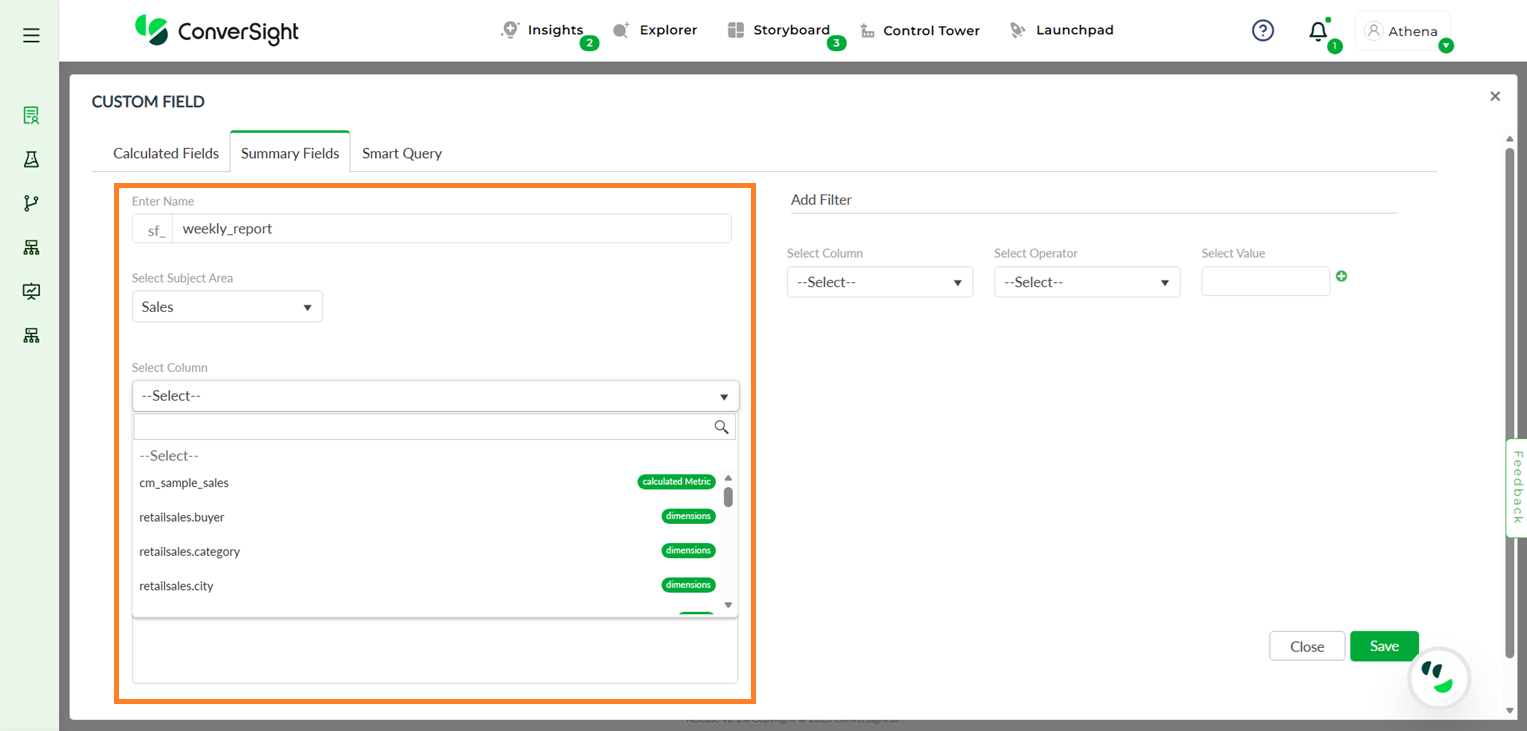 Step 6: Summary Fields feature also enables users to customize queries by adding filters. The Add Filter option requires the column name, operator for that column, and values if necessary. Columns can have different types such as metrics, dimensions, dates, flags, calculated metrics and calculated dimensions. Depending on the type of column selected, relevant operators will be loaded and values can be added. Choose the column that needs to be filtered.